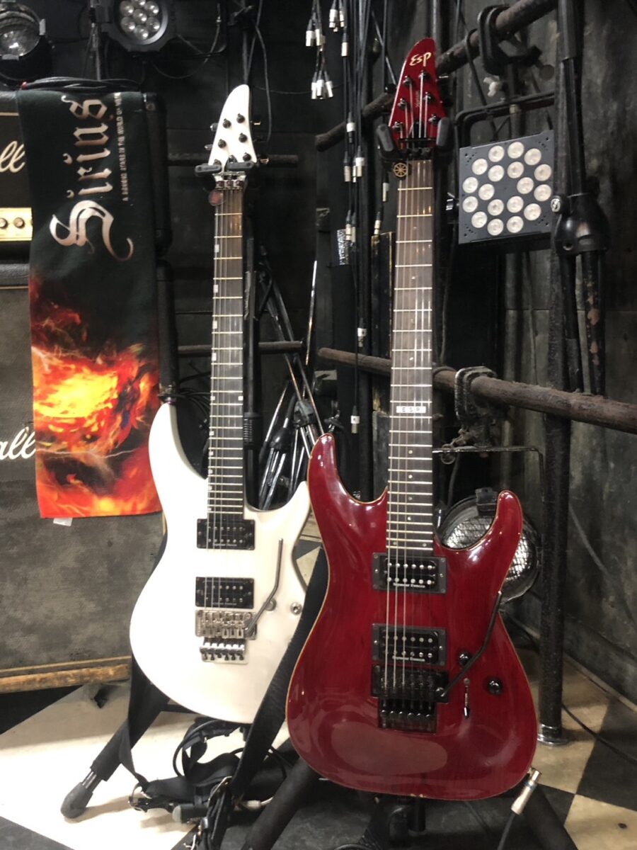 上記写真手前(右)がメインギターの『赤鬼さん』ことESP HORIZONシリーズ。奥の白いギターがサブギターの『白米ちゃん』(EDWARDS E-HR-130III)だ。