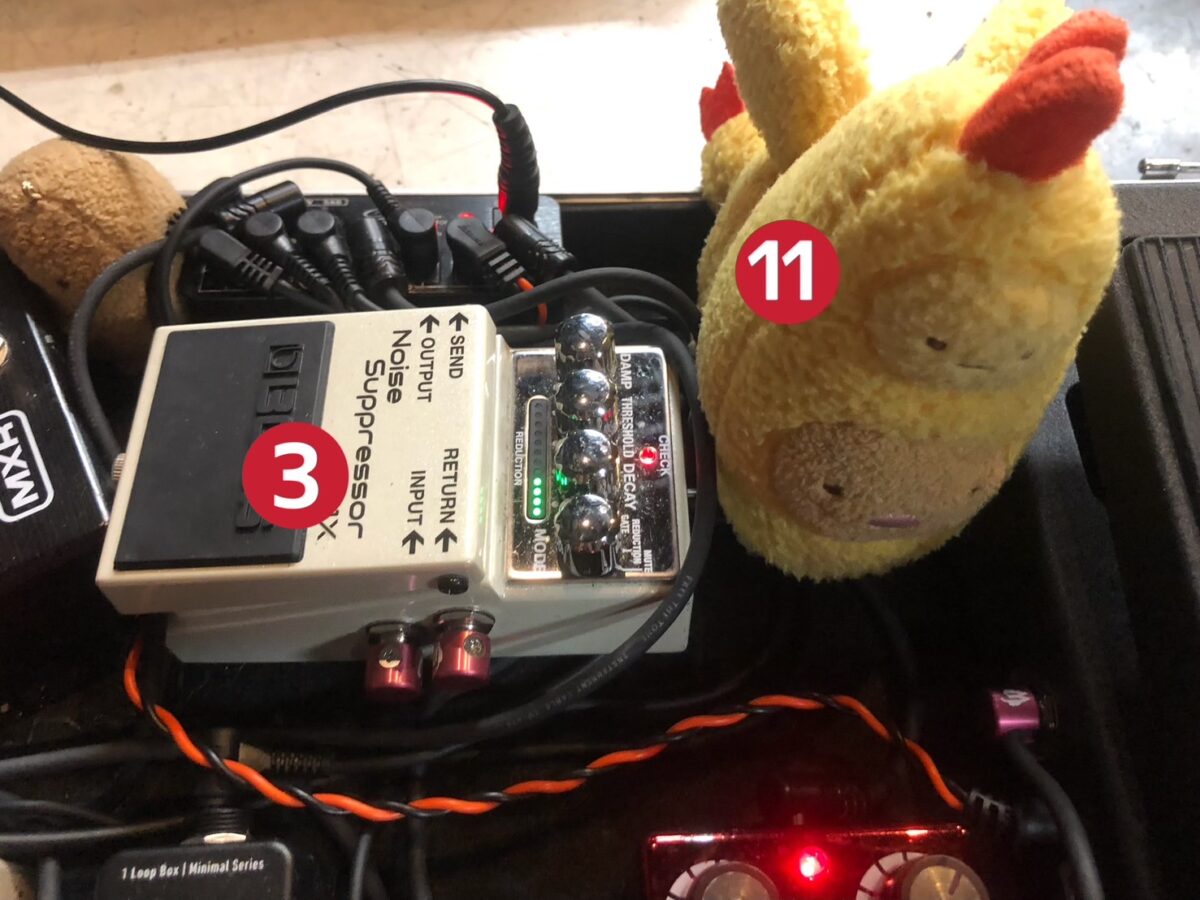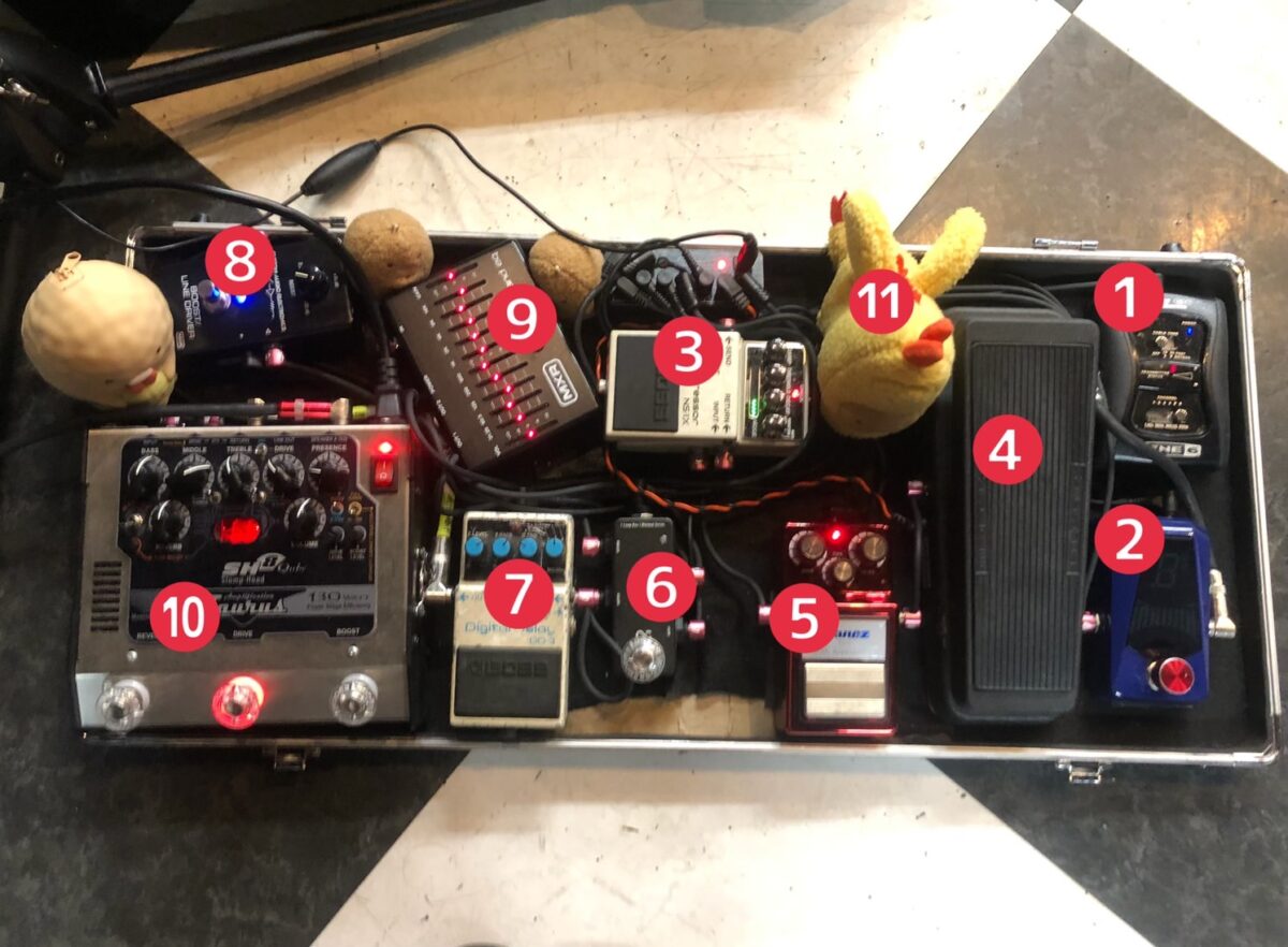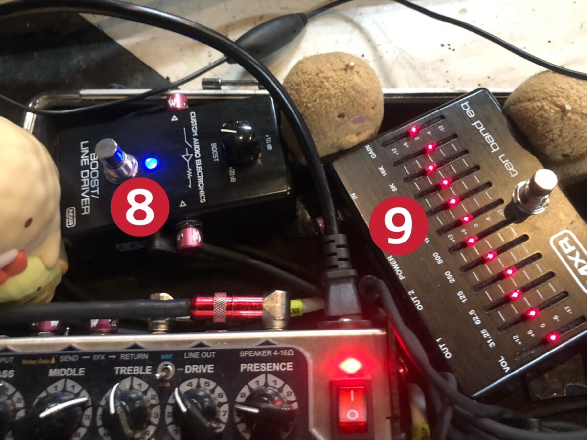 こちらがあにゃのペダルボード。セッティングは、アンプのインプット前に ( 1 ) ~ ( 3 )、( 3 ) のノイズサプレッサーのセンドリターンに ( 4 ) ( 5 )、アンプのセンドリターンに ( 6 ) ( 7 )、( 6 ) のスイッチャーのセンドリターンに ( 8 ) と ( 9 ) が接続されている。