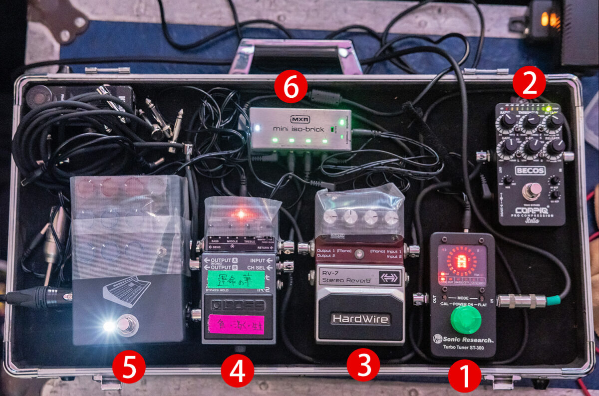こちらがステージ袖にセットされた理名のペダルボード。 ( 3 ) のリバーブは ( 4 ) のSEND/RETURNに接続されている。音色を使い分けるためと言うよりも作り込んだアンプ~キャビネットまで含めたサウンド(のシミュレーション)をボードだけで完結させられるようなシステムが組まれている。 ( 4 ) に貼られたシールから、『運命の華』とそれ以外の楽曲でサウンドを切り替えていることが分かる。こちらのボード内はすべてローディースタッフ所有のものを借りて使用しているそうだ。