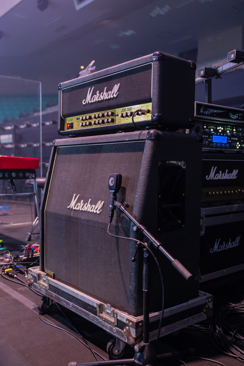 アンプはヘッドがMarshall JCM2000 TSL100、キャビネットがMarshall 1960A。アンプの裏にはKemper Profiling Amplifierもセットされているがこちらはバックアップ用で今回は使用されなかったそうだ。アンプはクリーンチャンネル以外のツマミがすべて0にセットされており、クリーンチャンネルのみを使用しているのが見て取れる。