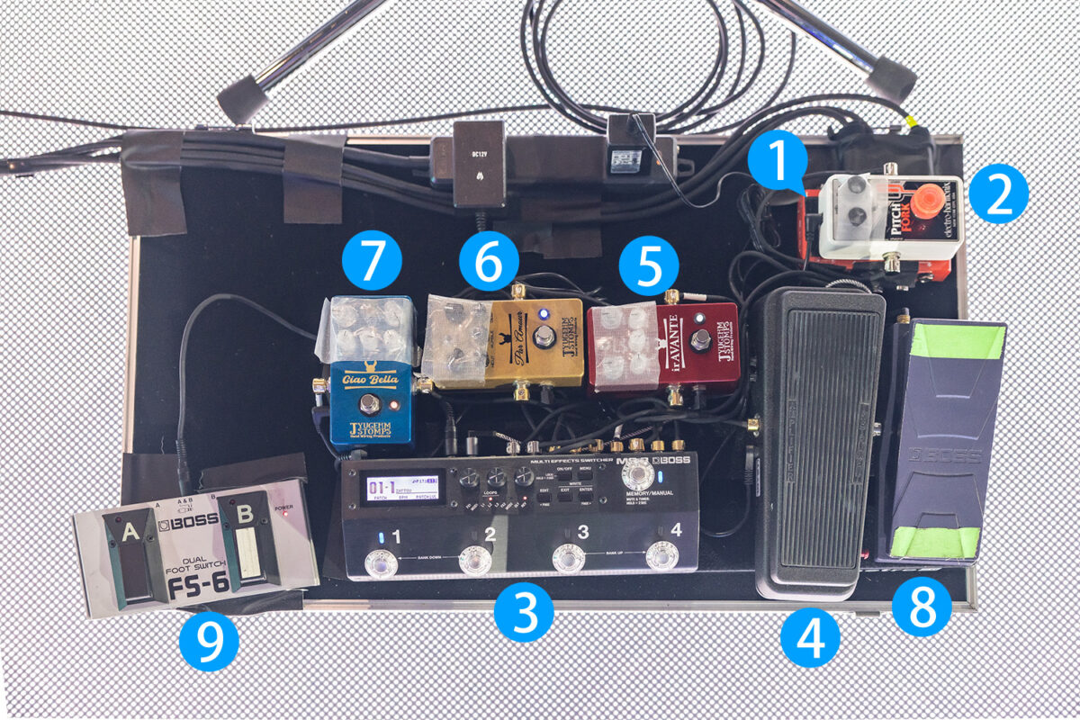 夕莉のペダルボードがこちら。本誌での以前の取材時からさらにJYUGEHM STOMPS製のドライブペダルが増えており、より多彩な歪みサウンドを使い分けているようだ。なお、ボードの下の床面はLEDディスプレイになっているためこのように見えている。( 1 ) ( 2 ) はローディースタッフ所有のものを借りて使用している。