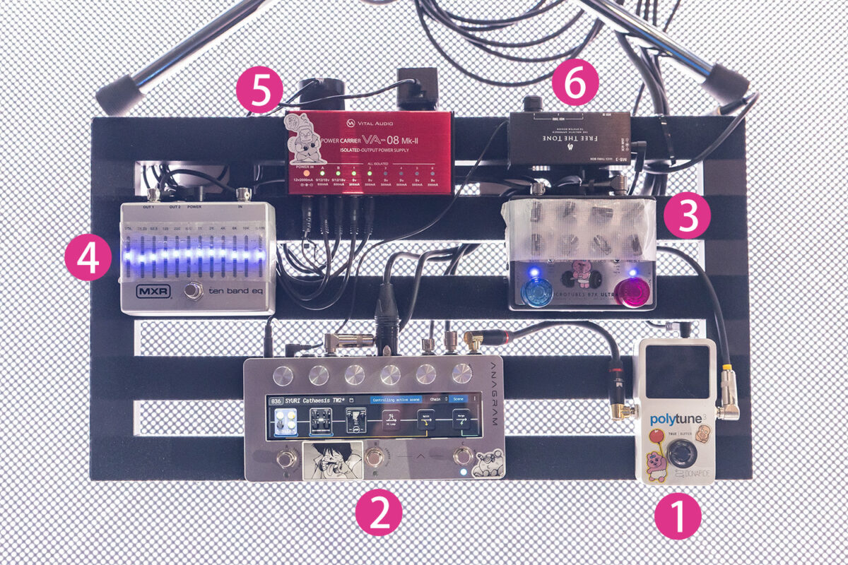 新たに導入された ( 2 ) Darkglass Electronics ANAGRAMを中心にした朱李のペダルボード。しかしながら、以前から使用している ( 3 ) B7K Ultraと ( 4 ) M108Sも引き続き使用されており、この2台はANAGRAMのエフェクトループ(SEND/RETURN)に接続されている。( 6 ) はローディースタッフから借りたものだという。