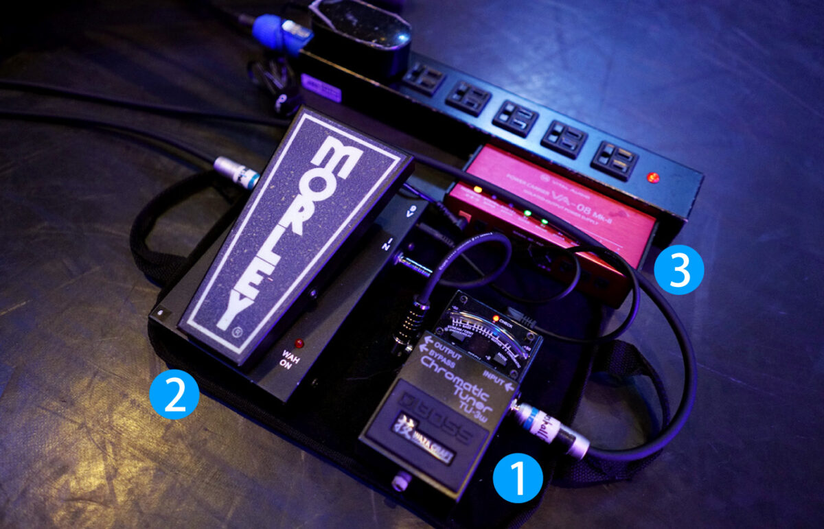 こちらがステージ上のYukiの足元にセッティングされているペダルボード。直接操作するワウペダルとチューナー、電源供給用のパワーサプライのみというシンプルなセットアップだ。