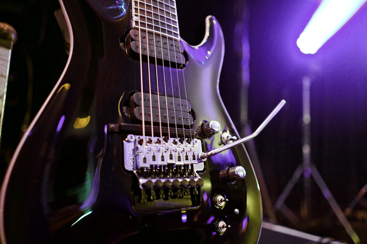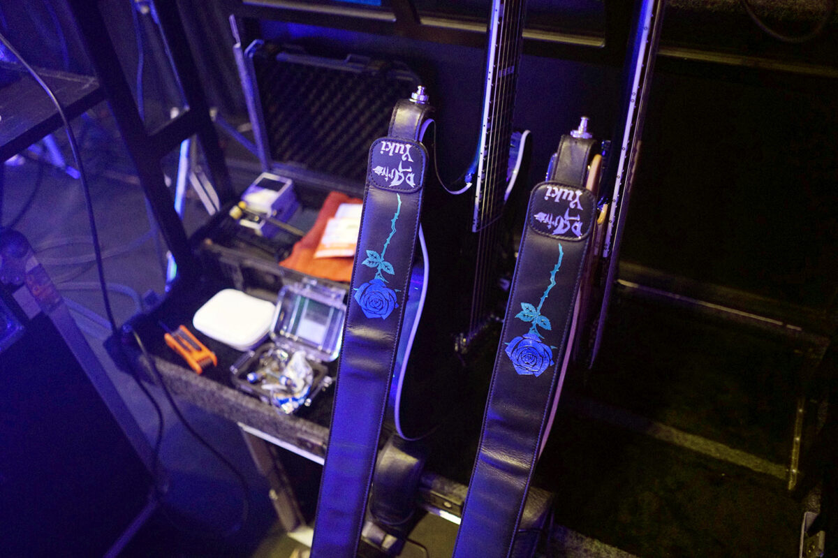 ギターのストラップはESP製のYukiシグネチャーモデルES-S-200DY。本牛革製の本体に青い薔薇の刺繍のワンポイントが映える。