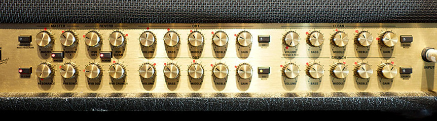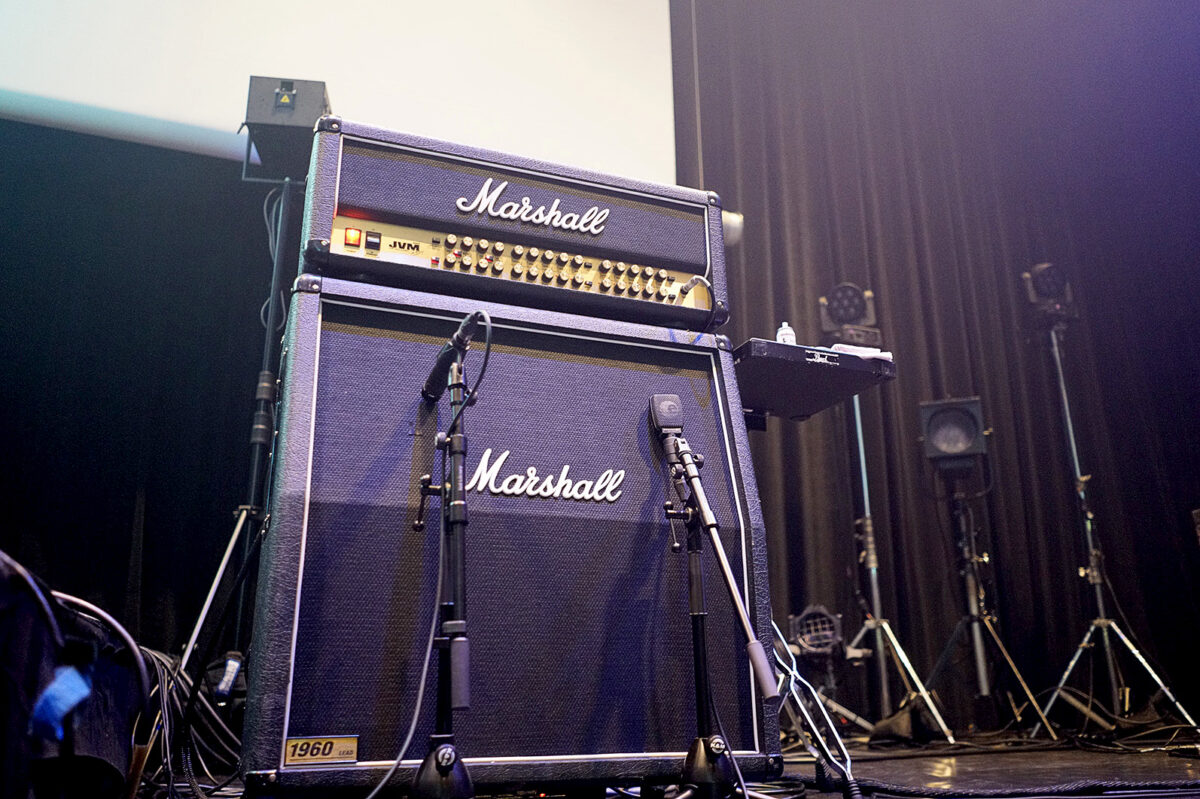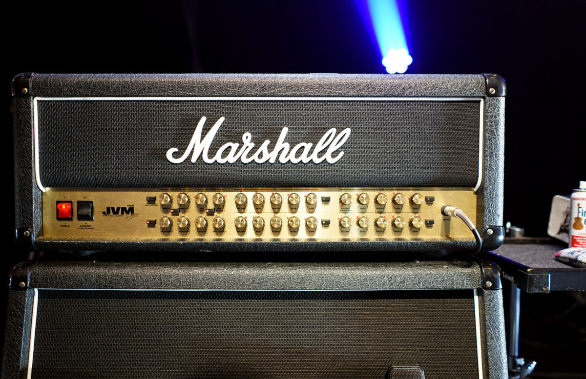 アンプはMarshall製のスタックで、ヘッドがMarshall JVM 410H、キャビネットがMarshall 1960Aだ。4発搭載されているスピーカーのうち2発がそれぞれ異なるマイクでマイキングされている。