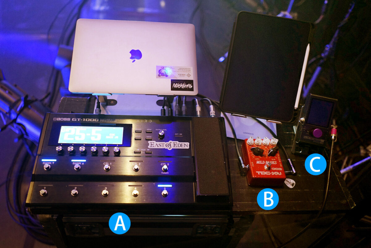 こちらはステージ袖に用意されたYukiのエフェクター。BOSSのギターマルチエフェクト・プロセッサーのフラッグシップモデルGT-1000とGT-1000のエフェクトループに接続されたオーバードライブペダルでそのサウンドを作り上げている。
