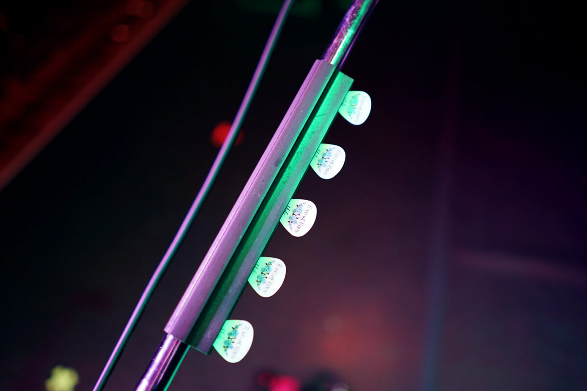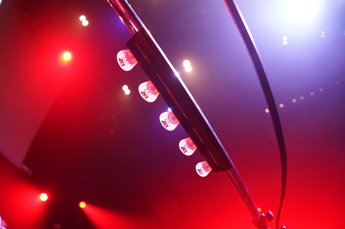 マイクスタンドのピックホルダーに用意されていたのはESP製のシグネチャーピックESP PA-EY08。Yukiのトレードマークの青い薔薇とEast Of Edenのロゴがデザインされている。ティアドロップ型で素材はポリアセタール、厚さは0.8mmだ。