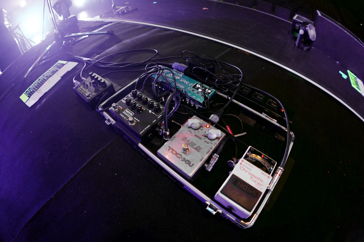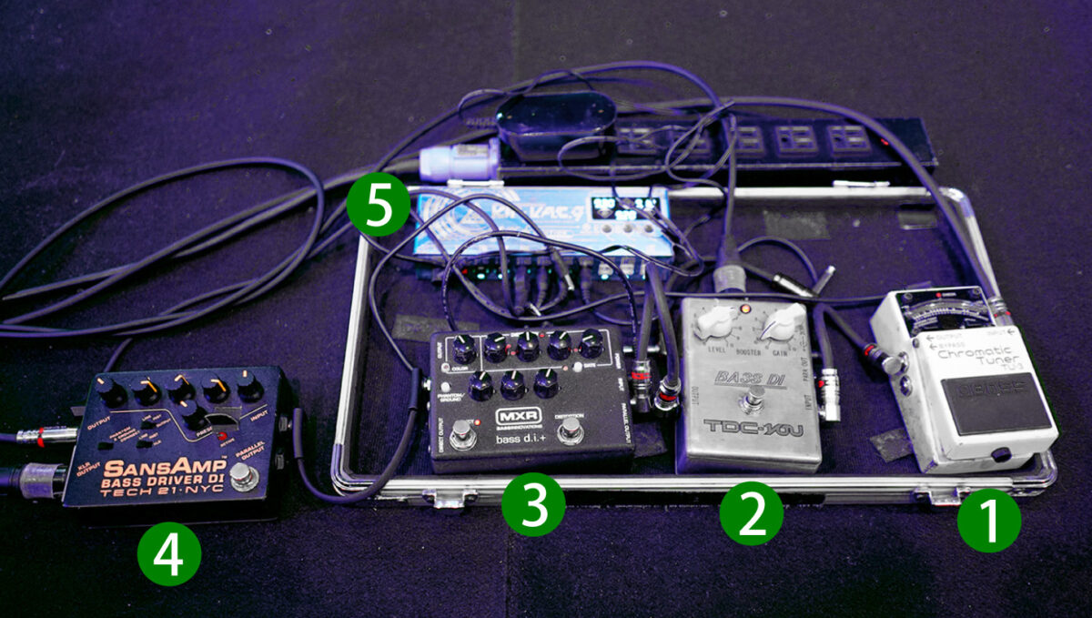 MINAのペダルボードがこちら。( 3 ) ( 4 ) のプリアンプの前にDIを接続しラインの音を出力している。また、( 4 ) Sans Amp Bass Driver DIのXLRアウトも使用されており、サンズアンプで歪ませたサウンドもラインに出力できるセットアップだ。