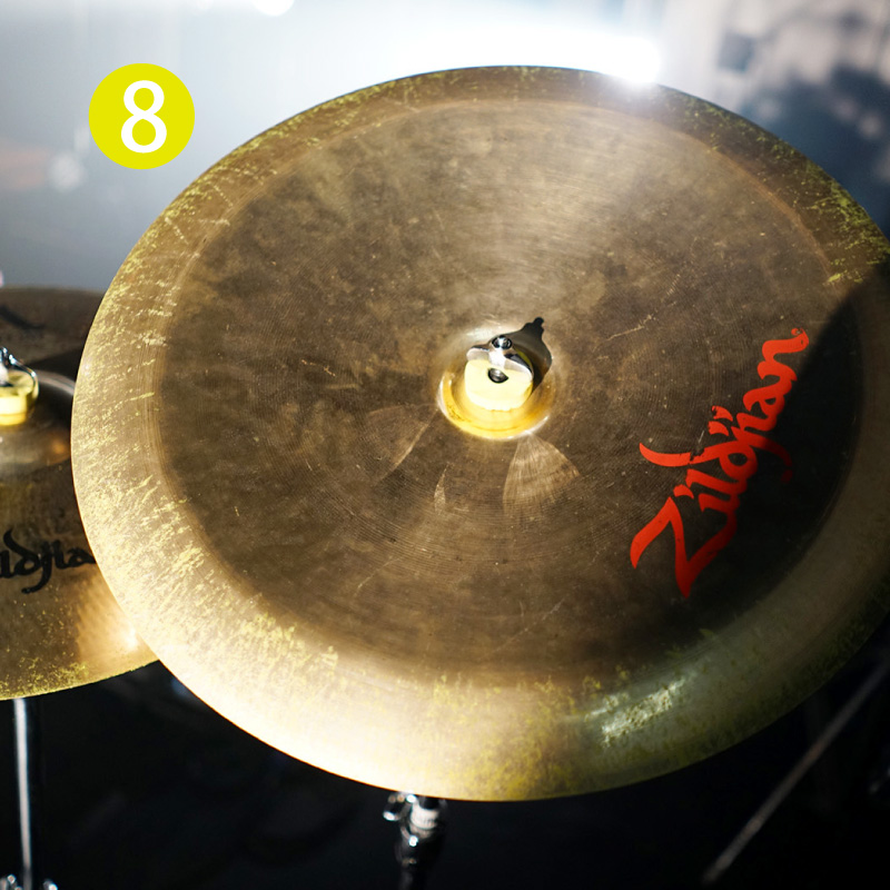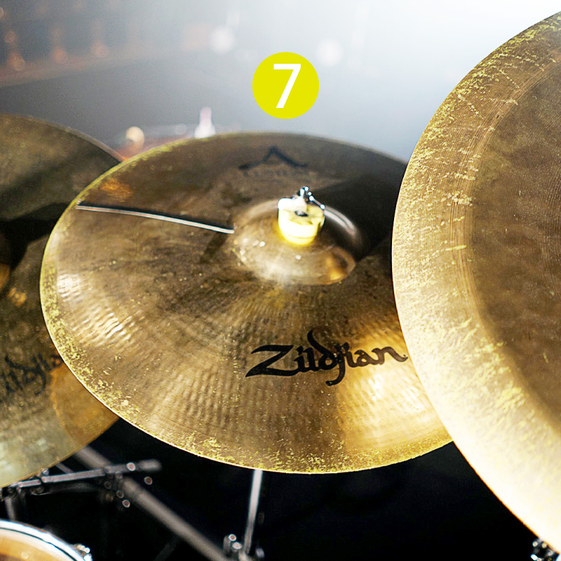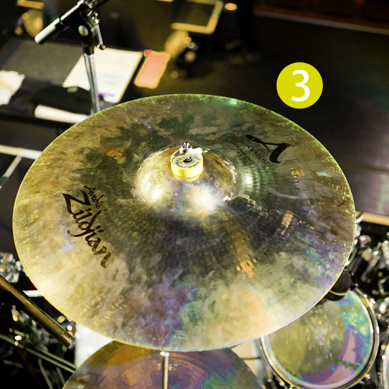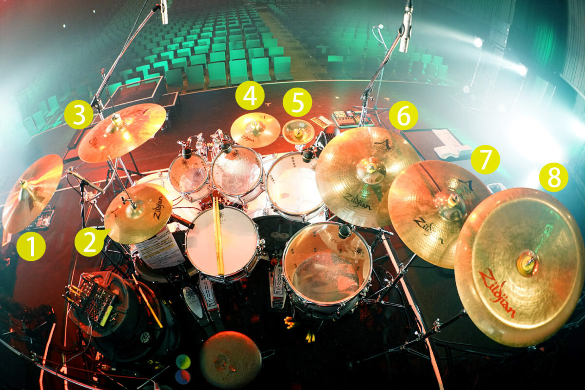 シンバル類はすべてZildjian製で、ラインナップは下記の通り。前回取材時はK ZildjianやK Customシリーズを中心としたラインナップだったが、今回はA Customを中心としたラインナップに変更されていた。左手側のクラッシュ ( 3 ) は円弧を描く湾曲した形状のPearl “Boomerang” Boom Arm Standを使用してセットされている。