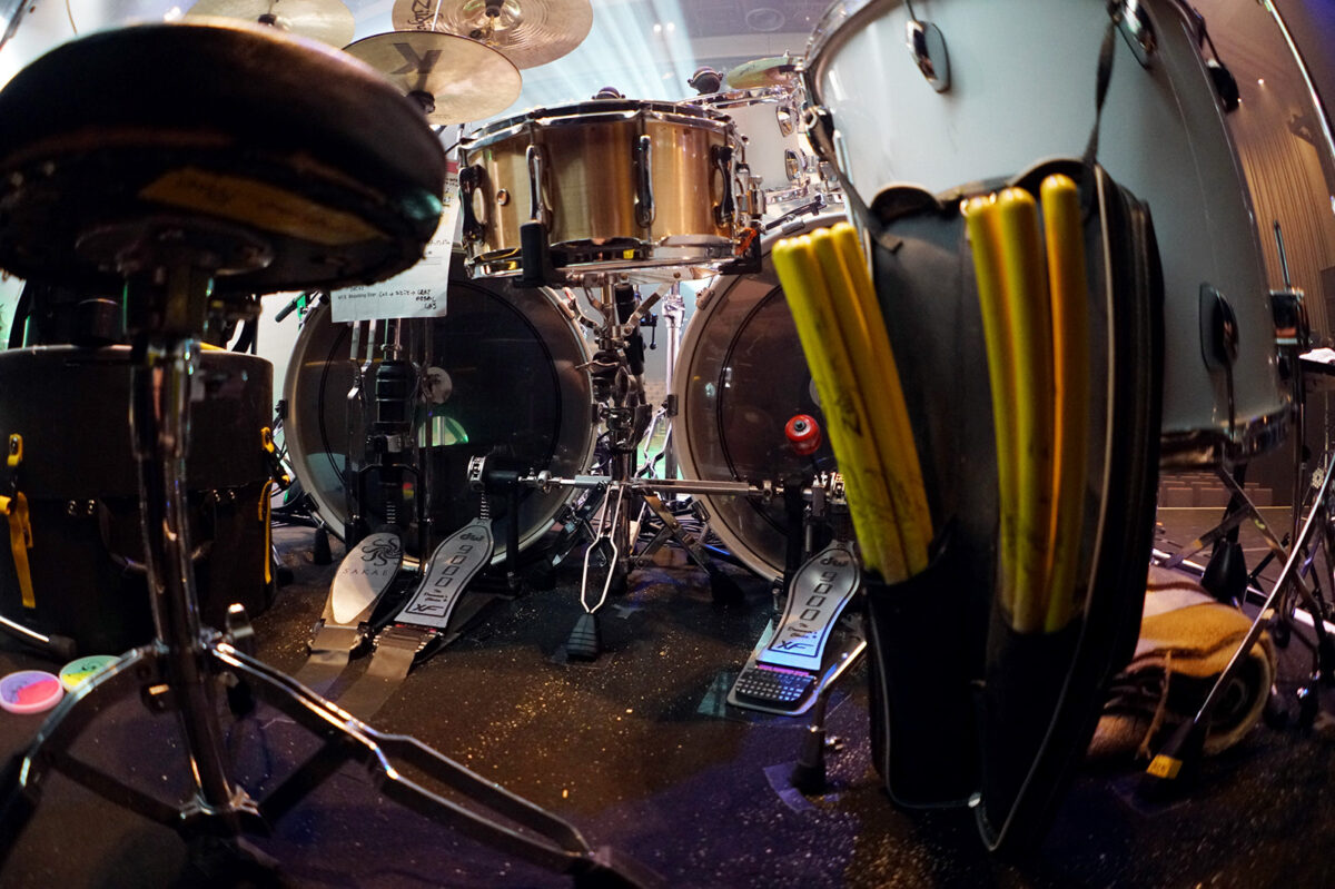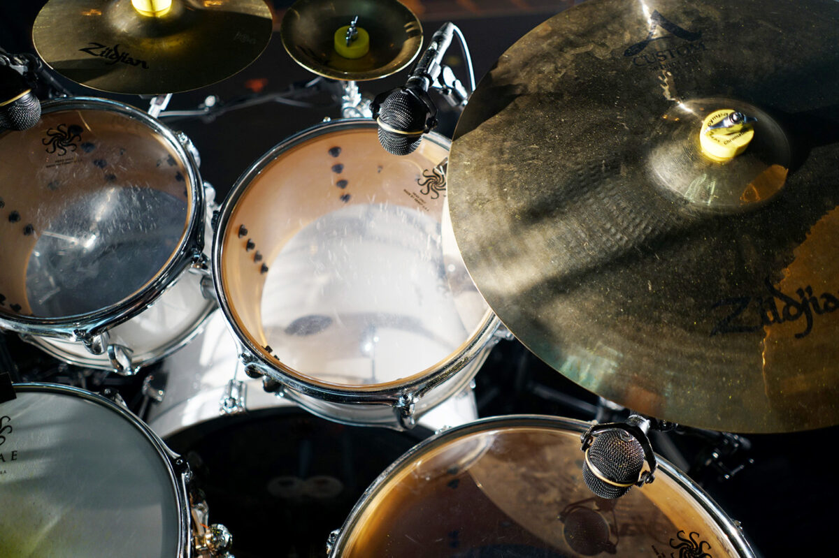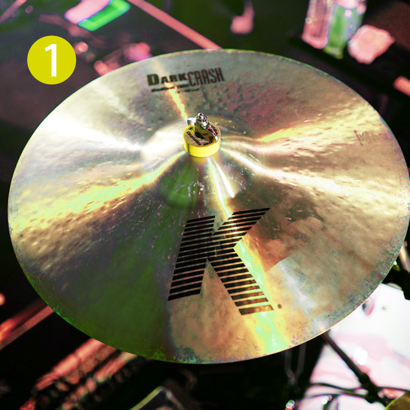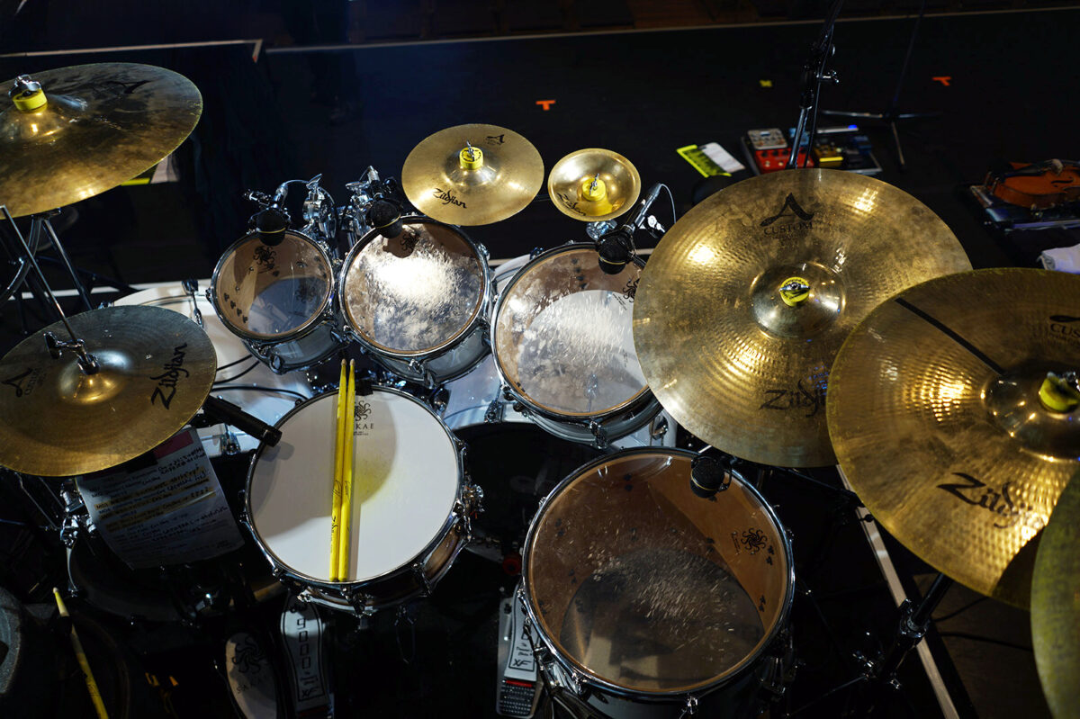 シンバル類はすべてZildjian製で、ラインナップは下記の通り。前回取材時はK ZildjianやK Customシリーズを中心としたラインナップだったが、今回はA Customを中心としたラインナップに変更されていた。左手側のクラッシュ ( 3 ) は円弧を描く湾曲した形状のPearl “Boomerang” Boom Arm Standを使用してセットされている。