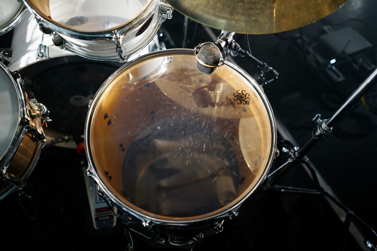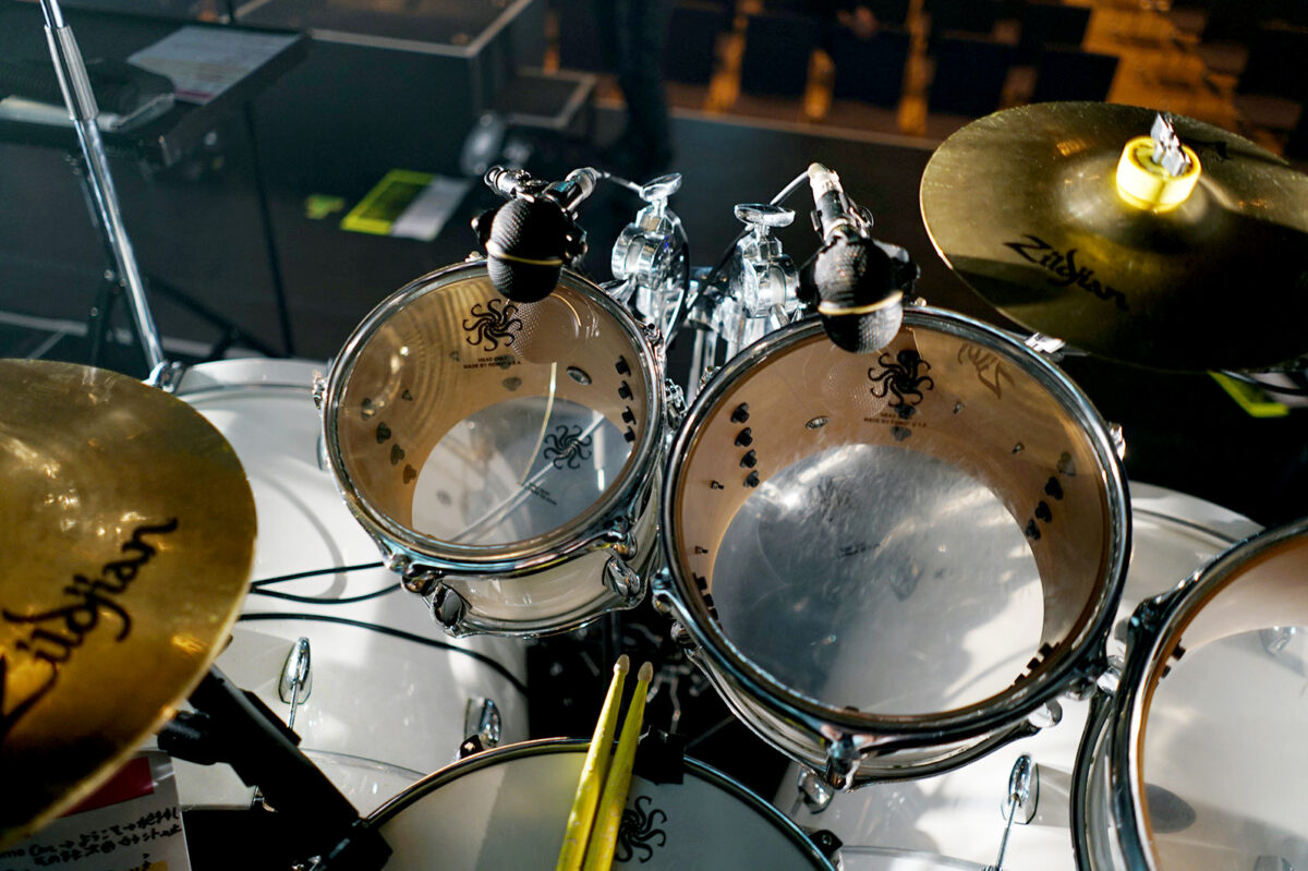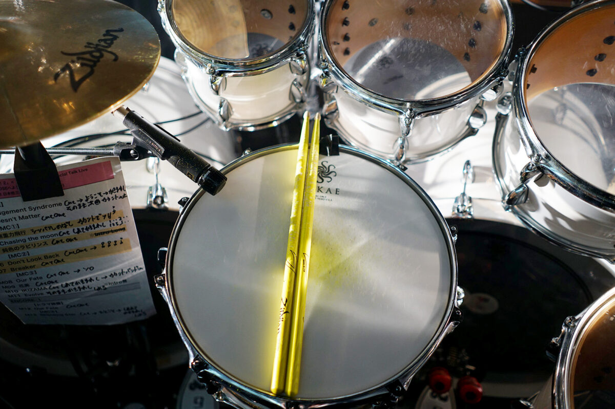 スネアはSAKAE Drums Phosphor Bronze SDM1465PBJ。SAKAE Drumsのフラッグシップモデルとも言えるJAPAN CUSTOM SNARE DRUMSにラインナップするモデルで、3mm厚の削り出しフォスファーブロンズシェルを採用し、“SAKAEサウンドを体現する究極のスネア”とも言われる。