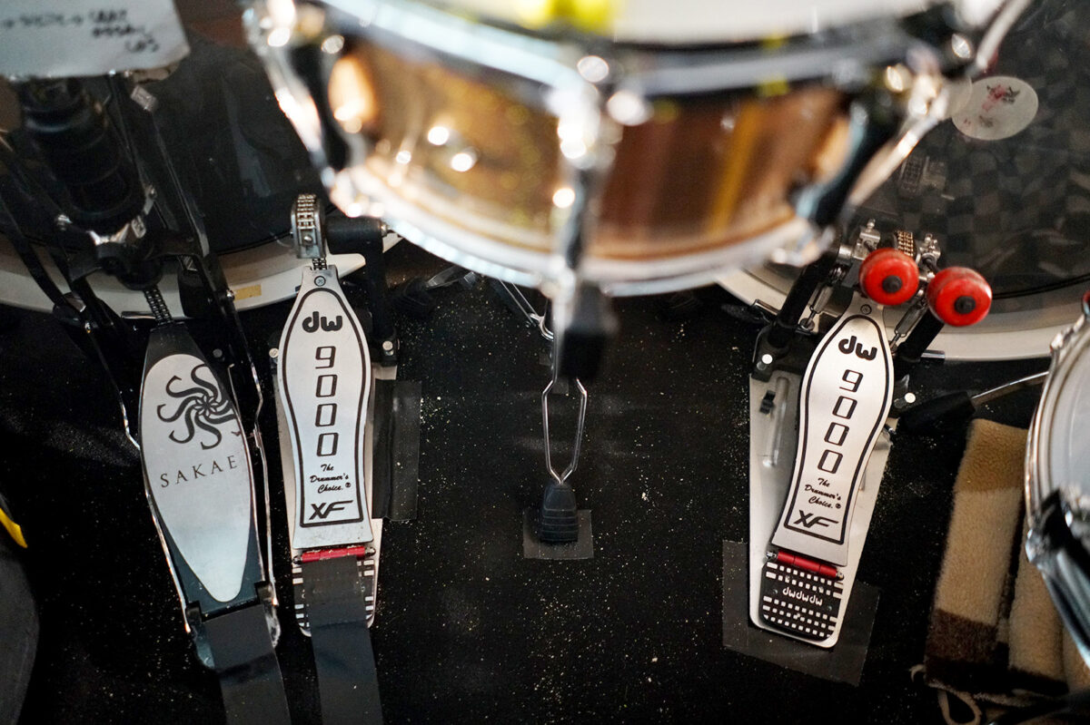 キックペダルはdw 9000XFのツインペダル。通常のdw 9000よりもフットボードが1インチ長いロングフットボード仕様のモデルだ。