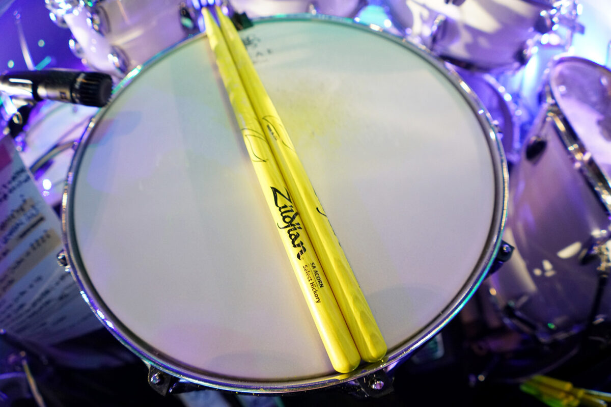 スティックはZildjian Select Hickory 5A ACORN Wood Neon Yellow。5Aと5Bの中間という新しい形状のACORNチップを採用したモデルだ。