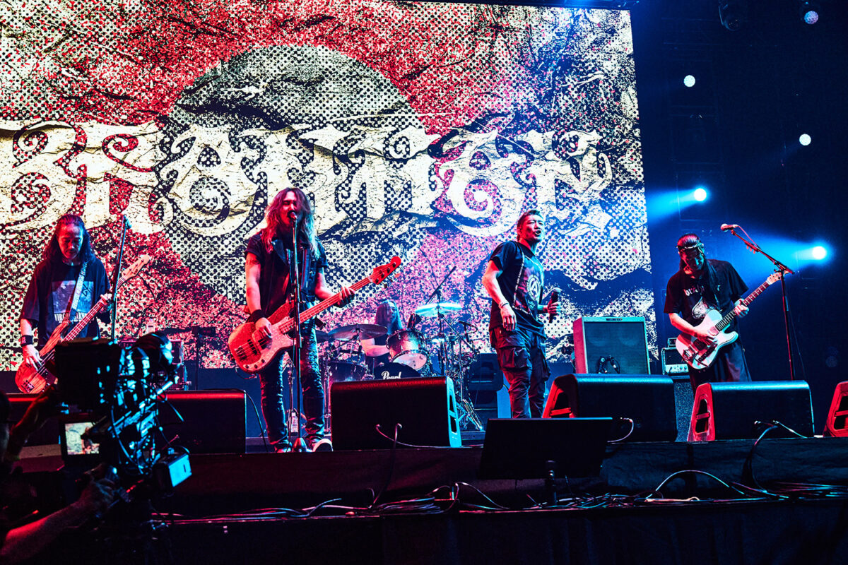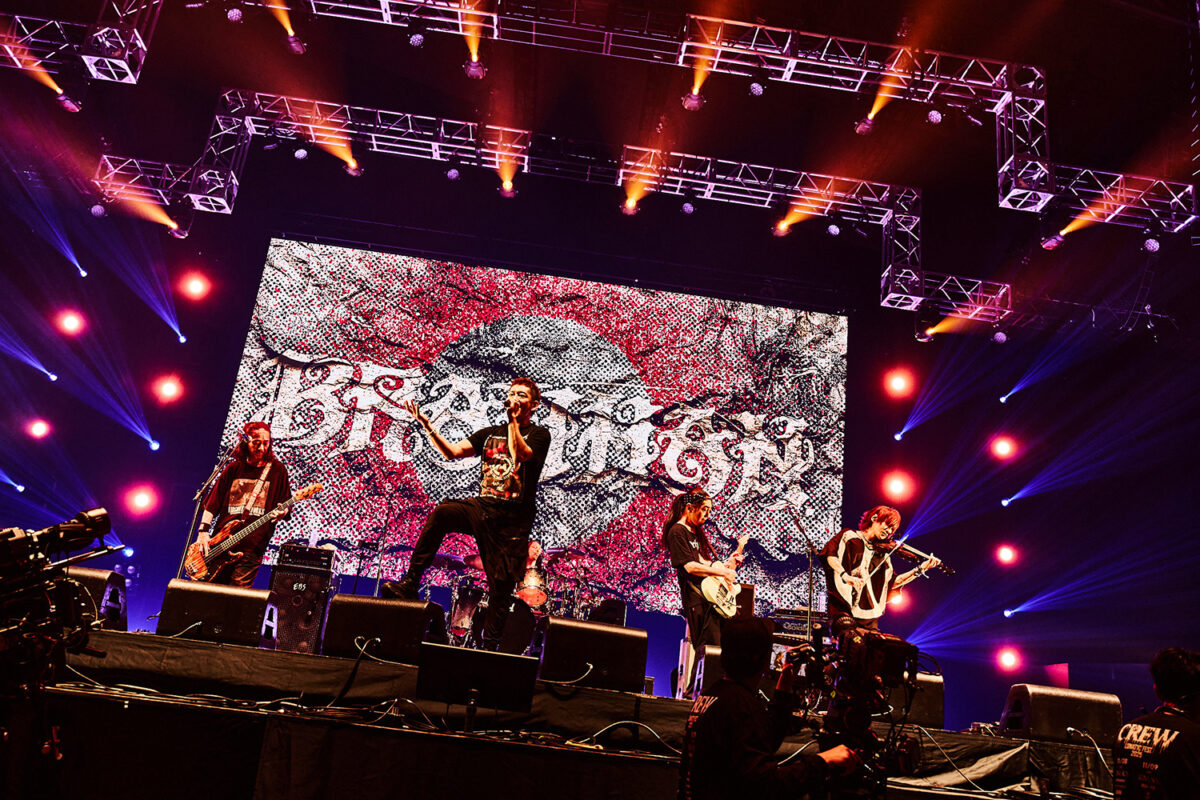 いきり立つ音と歌声を殴りつける『賽の河原』でもBRAHMANは、重く歪む音の鉈で観客たちの理性を断ち切り、感情を壊していく。立て続けにBRAHMANは『BASIS』や『SEE OFF』を突きつけ、観客たちの身体を激しく揺さぶり続ける。どんな場だろうと彼らは、いつだって自分たちの色にその場を染めていく。掻き鳴らすギターの音色と激しく躍動するリズムを合図に、BRAHMANは『BEYOND THE MOUNTAIN』を演奏。さらに『順風満帆』を通して彼らは、この会場を身体が踊るサイコな宴の場に染め上げていった。