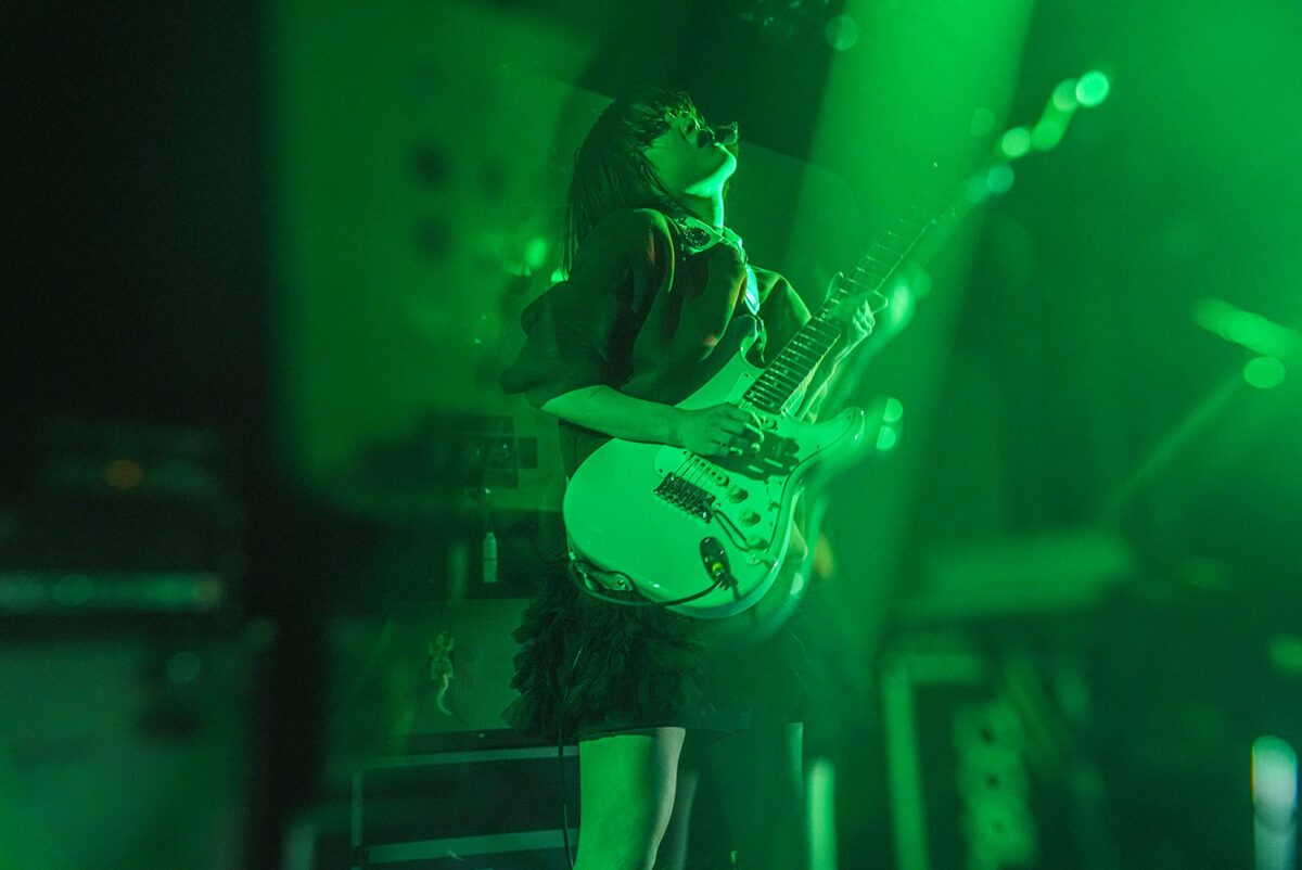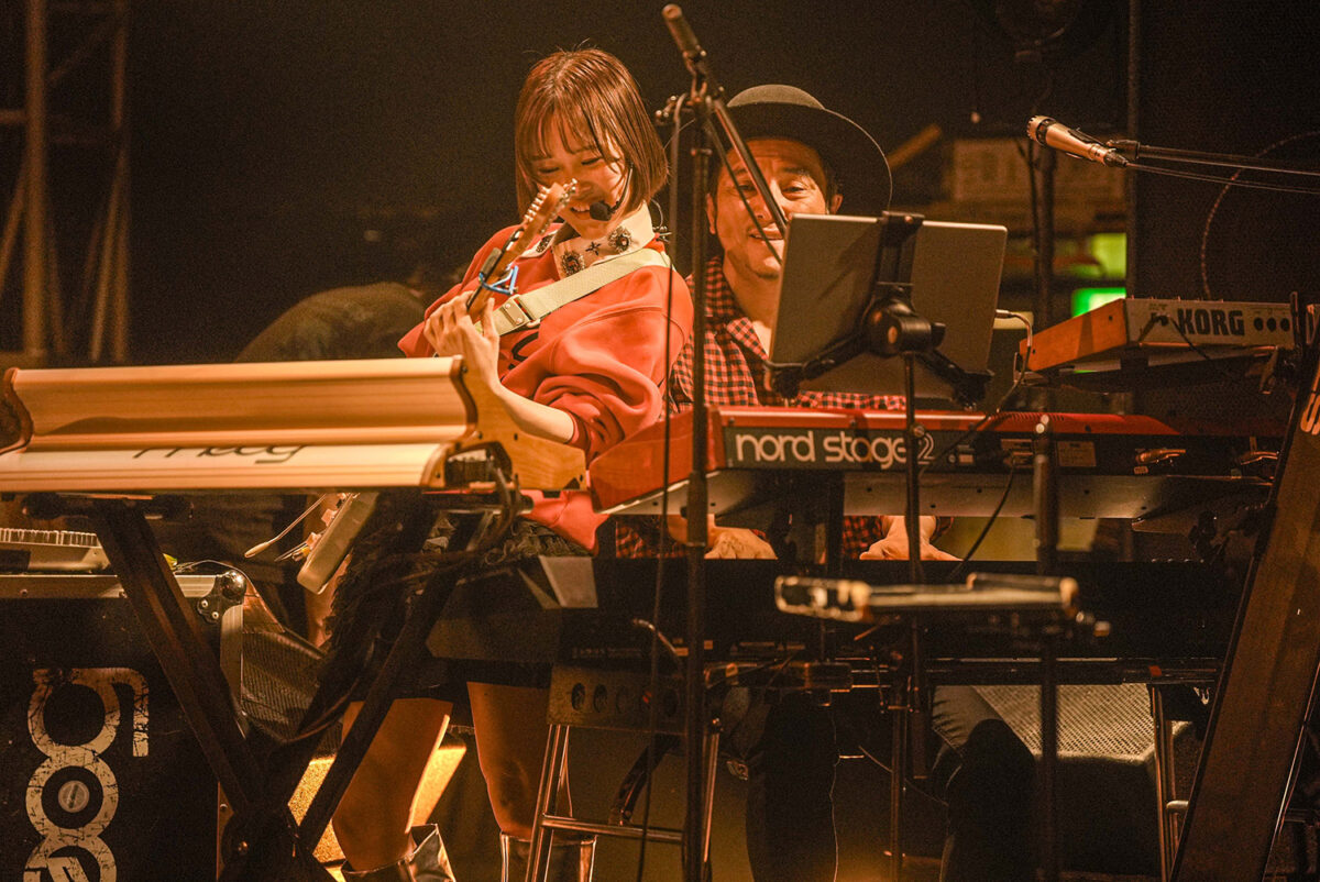 攻撃的かつ胸の踊るリフを次々と繰り出しながら、Reiは『COCOA』を演奏。心地よい緊張感を抱いたテンションの高い演奏が爆走しながら迫り続ける。巧みにトリッキーなプレイも組み込み、彼女は腰をグッと落とした姿で、次々と気持ちを騒がせるリフビートを刻み続けていた。Reiが大きく手を振りながら歌う姿に合わせて、フロア中の人たちも大きく手を振り、あふれだすファンキーなグルーヴミュージックに身を預け、熱狂するままに踊っていた。