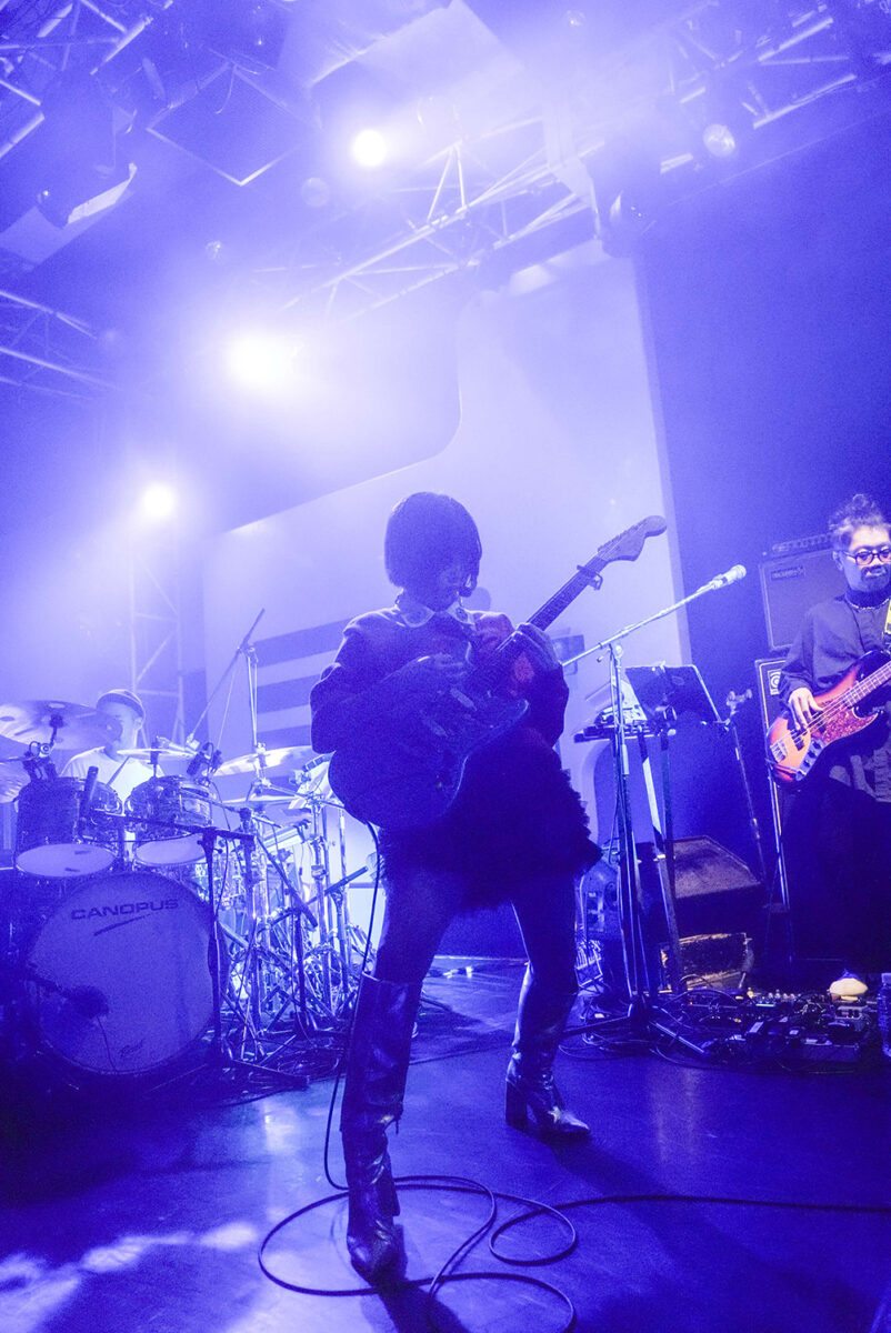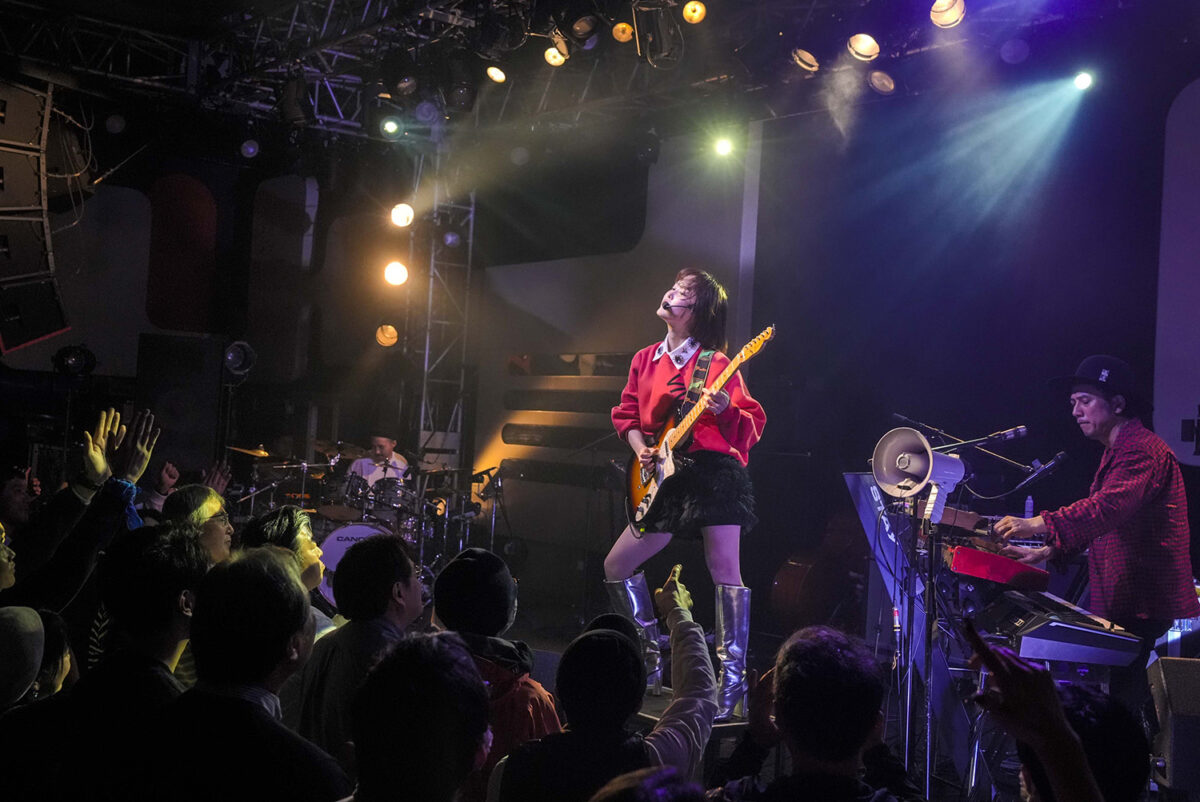 ブルーズなセッションのような始まりだ。楽器陣が自由奔放にアバンギャルドな音をぶつけあう。その空気を切り裂くように、Reiのギターが炸裂。そこへジャングルビートが鳴り出すのを合図に、この場を華やかながらも妖しい空気に染め上がる。続く『Lonely Dance Club』はSOIL &”PIMP”SESSIONSとコラボした楽曲。ここでは、スリリングでジャジーなムードを作りだす演奏の上に、Reiの歌声が華やかな色を描き加えていた。野生味あふれる荒々しいジャズ楽団の演奏を、お茶目で破天荒な歌姫がリードしていくような雰囲気だ。この曲の演奏中は、この会場が、妖しくもゴージャスな香りを満載にした昭和のCLUBのような色に染め上がっていた。