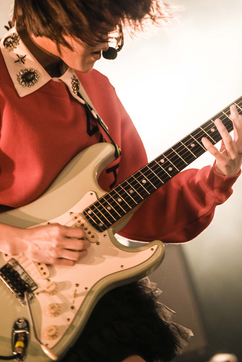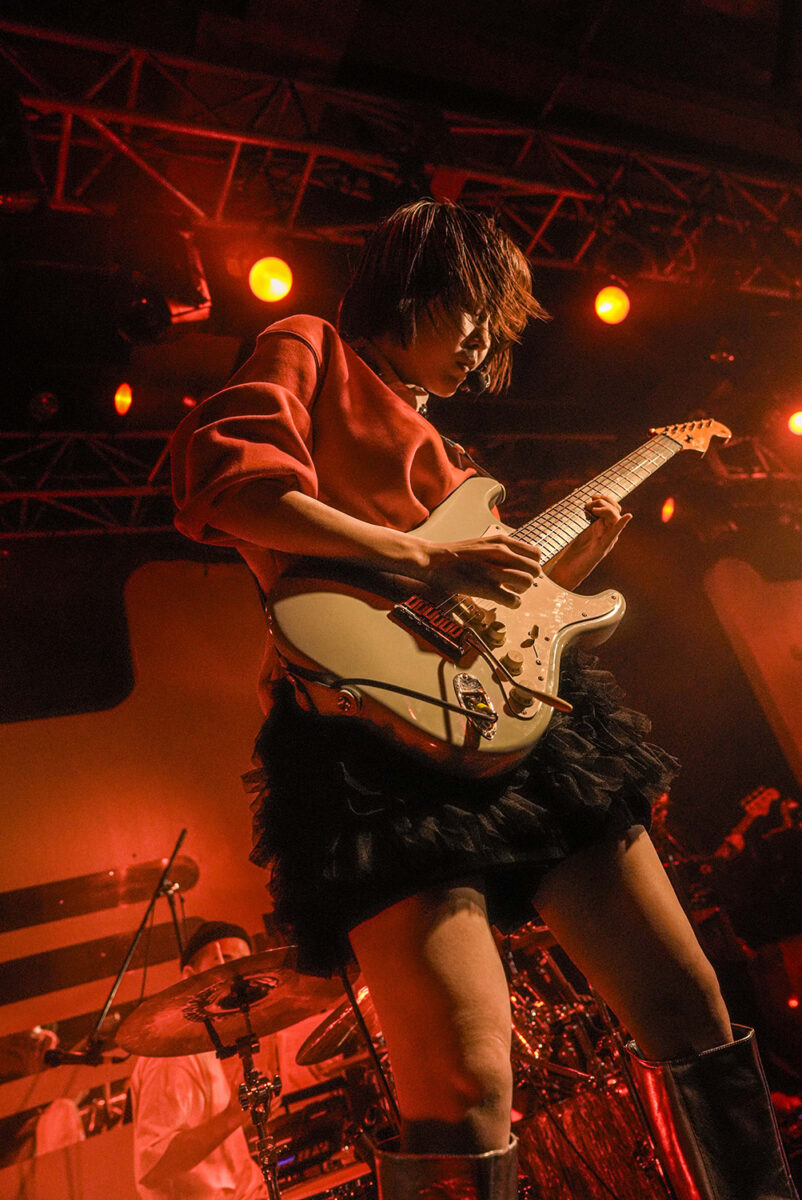 切れ味鋭くも軽やかなギターの音を響かせるSEが駆けるように流れだした。一瞬にして沸き上がった場内。演奏に合わせてフロア中から力強いクラップが響き渡る。楽器陣のホンキートンクなセッション風の演奏へ導かれるように、鮮烈な赤の衣装にシャープに輝くシルバーブーツを纏ったReiがステージに登場。彼女はフェンダーで制作したシグネイチャー・モデルのギター”Rei Stratocaster R246″を手に、ラジオボイス風に声を変えたマイクを通して観客たちを「Are You Ready?!」と煽りだす。そして…。