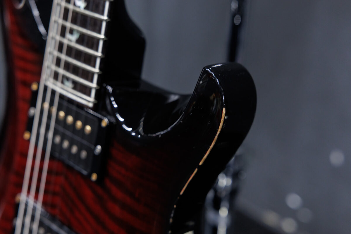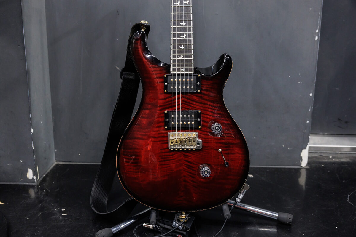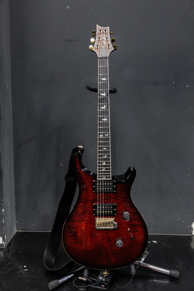 Kahoのメインギターは最早彼女のトレードマークとも言えそうなPaul Reed Smith 30th Anniversary Custom24。PRSファクトリー設立30周年を記念して2015年に発売されたアニバーサリーモデルで、通常のモデルとは異なる豪華な装飾が施されている。使用弦はERNIE BALL Regular Slinky #2221 10/46だ。