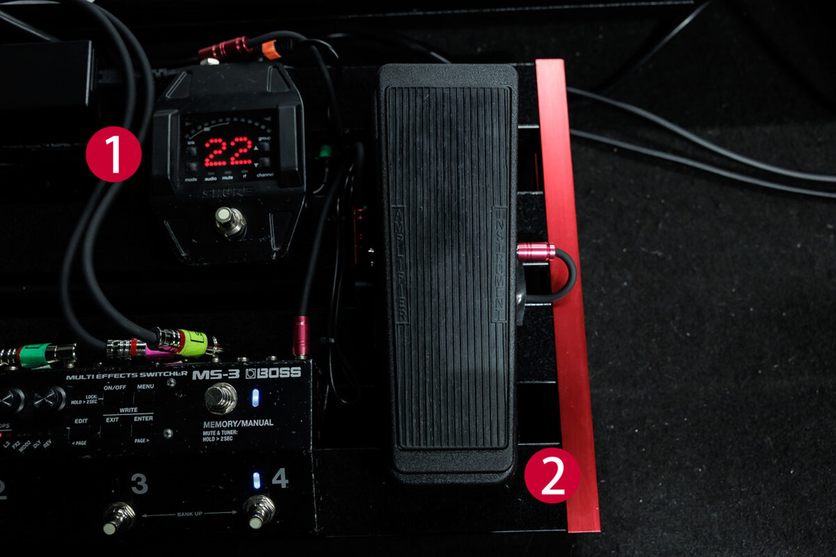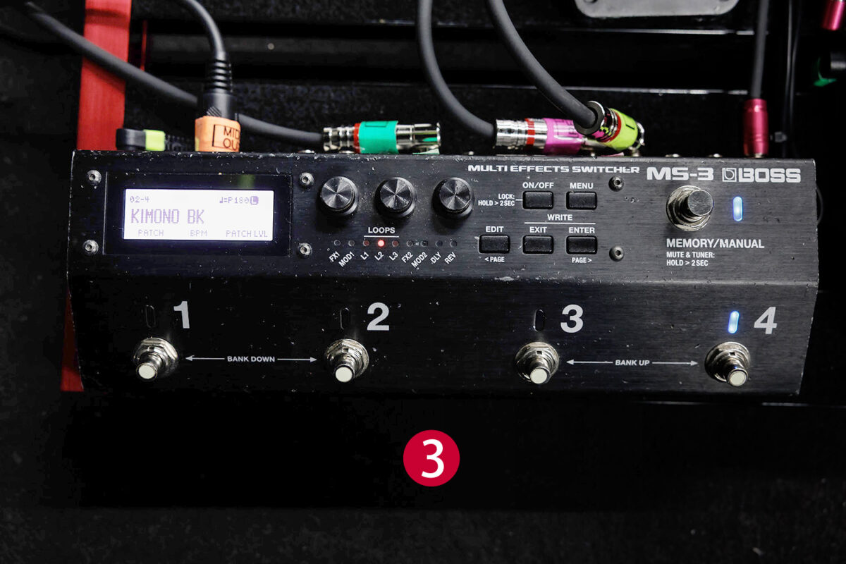 Kahoのペダルボードの中心である ( 3 ) のBOSS MS-3は、スイッチャー機能はもちろん、BOSSならではの高品位なエフェクトが多数内蔵されており、様々なサウンドを操ることができる。アンプとMIDI接続されており、アンプのコントロールも一括して行えるようにセッティングされている。