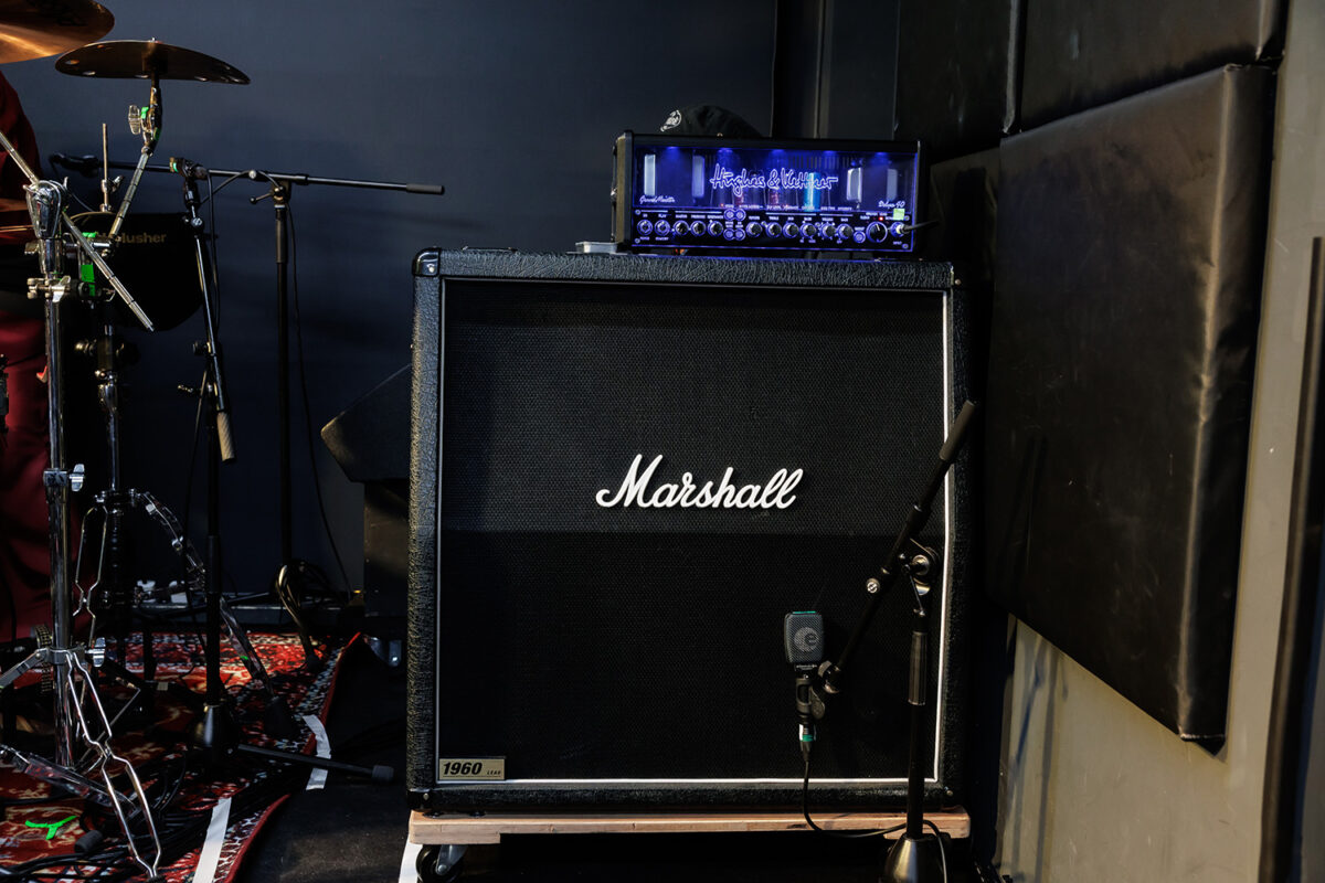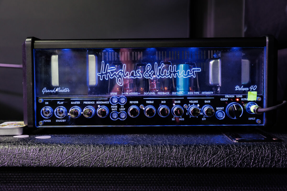 アンプは、Hughes&Kettner GrandMeister Deluxe 40ヘッドを使用。同社のフラッグシップモデルTri Amp Mark3にインスパイアされた回路デザインで、オールチューブ仕様のアンプにリバーブは勿論、ディレイやモジュレーションエフェクト、ノイズゲートまで搭載された様々なシーンで実力を発揮するアンプヘッドだ。キャビネットはMarshall 1960Aだ。