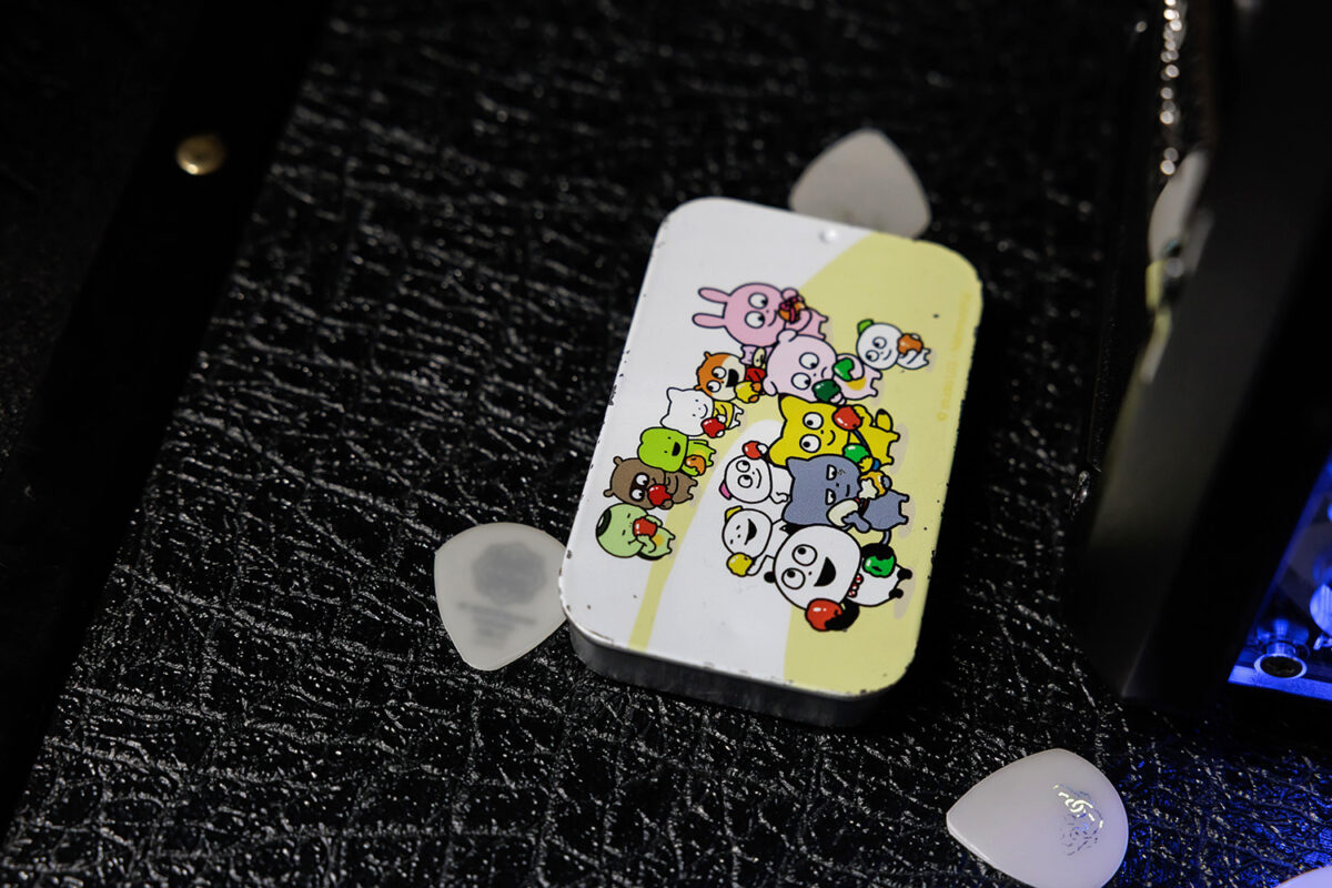 アンプキャビネットの上にはピックも置かれていた。Master 8 Japan製でジャズシェイプの自身のオリジナルピックを使用している。