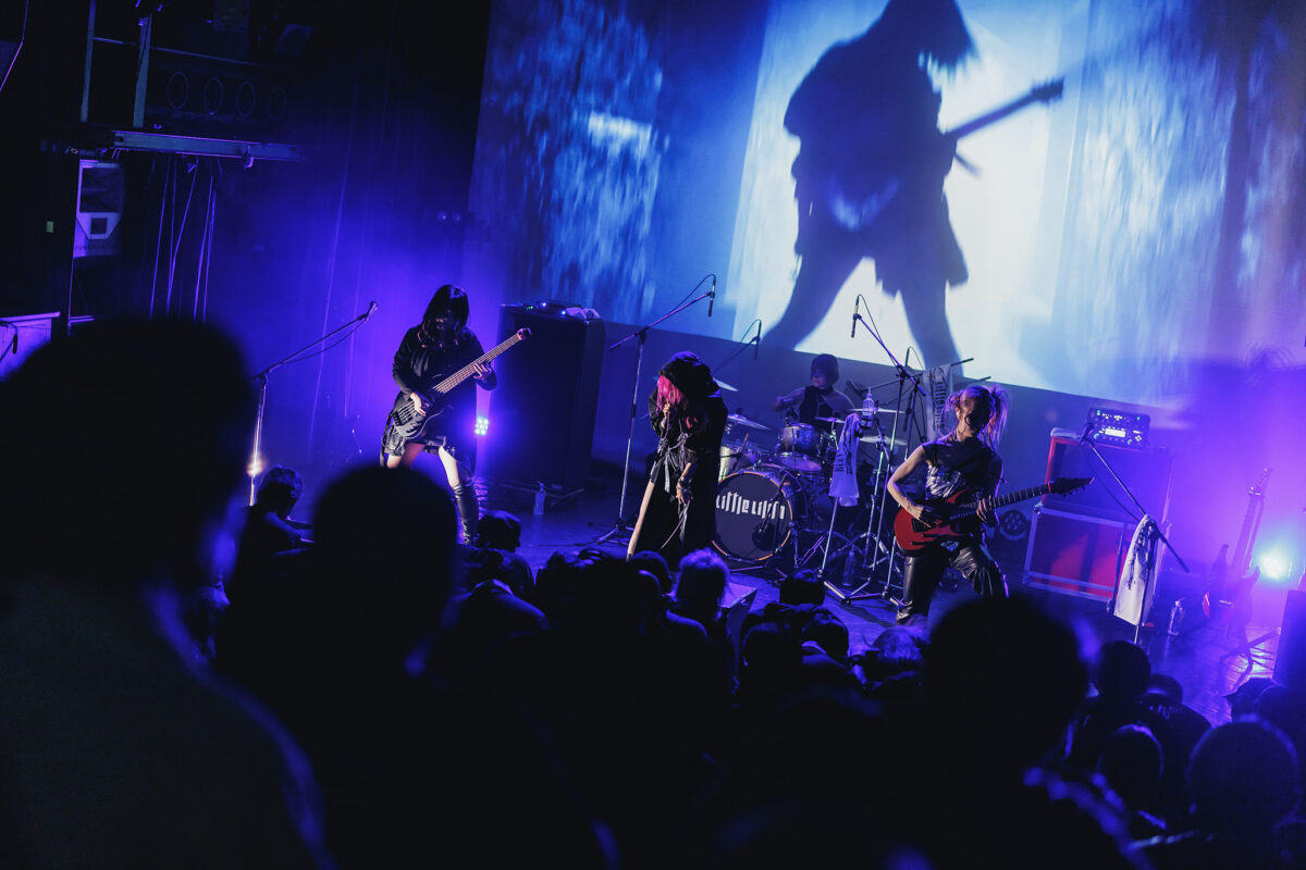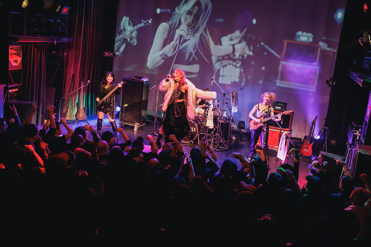 最新アルバム『RUIN』に収録した曲たちを中心に構成しながら、ライブは進んでいく。次に演奏したのが、バラードの『BLESSING』。いつも攻撃的な楽曲を突きつけるLittle Lilithだが、彼女たちが真正面から取り組んだバラードには、轟音の絵筆でスケール大きな景観を描きだしていた。胸の内に秘めた思いを解き放つように歌うLILLYの声も印象深いが、切れ味鋭くもどっしりとしたビートを刻むYUKIとSHIORIのリズム隊、その上に轟音の絨毯を敷いてゆくERIKAのギターがあるからこそ、この世界観が生まれている。胸を震わせるように歌うLILLYの声が、観客たちの心を歌の世界へと引き寄せていったのも印象的だった。
