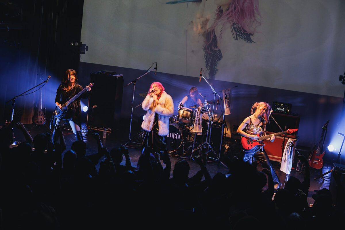演奏が始まるのを合図に、フロア中の人たちが身体を大きく折り畳み、ヘドバンに興じていく。4人もクールな装いで、これまで以上に凛々しい様で迫ってきた。とても荒々しくてスリリングな楽曲だ。刃先をなぞっただけでスパッと切れそうなほど鋭いナイフのような歌と演奏を4人は突きつけ、ふたたび観客たちに衝撃と衝動を与えていく。