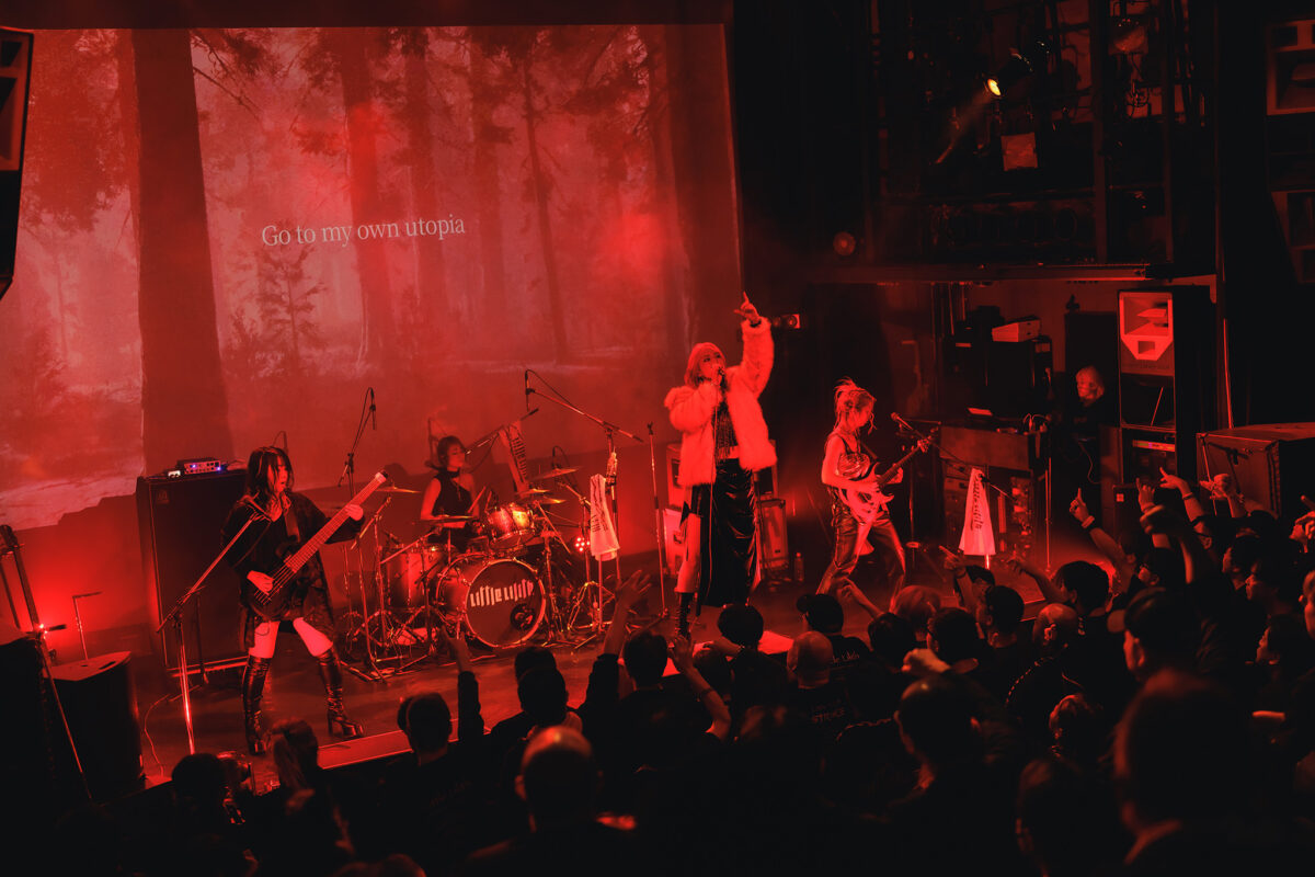 ふたたび熱狂を描きだそうと、LILLYのグロウルを合図に、Little Lilithは『Dystopia』を演奏した。巧みに緩急を付けながらも、ずっと荒ぶる音の衝撃を撒き散らすメンバーたち。剥きだした荒々しい感情と繊細な心模様を巧みにミックスしながら伝える、その世界観に触れ、心地よく落ちていた。「生きるべき場所はどこに」や「私はここで生きていくんだ」と歌うLILLYの声も、胸を痛く揺さぶった。