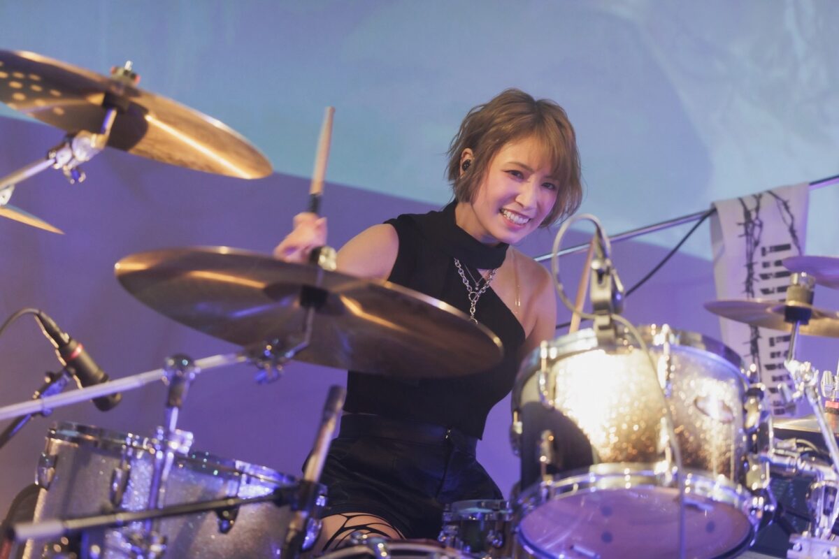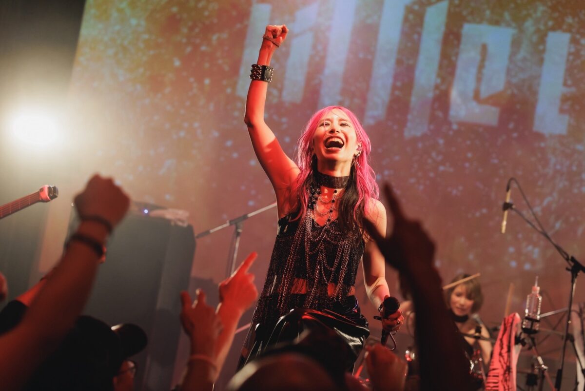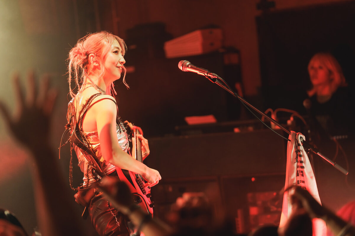 「Never say never だって」と歌うLILLYの声が高らかに響き渡る。それを合図に楽器陣が轟音の鉄槌を振り下ろした。『STRIKE』だ。背景にはMVも投影。激しい中にも歌心を抱いたエモーショナルな声が、観客たちの気持ちを揺さぶる。身体と気持ちの両方を同時に刺激する。だから身体は熱狂を求めながらも、心はずっと、彼女たちの生きざまを歌うLILLYの声に引き寄せられていた。