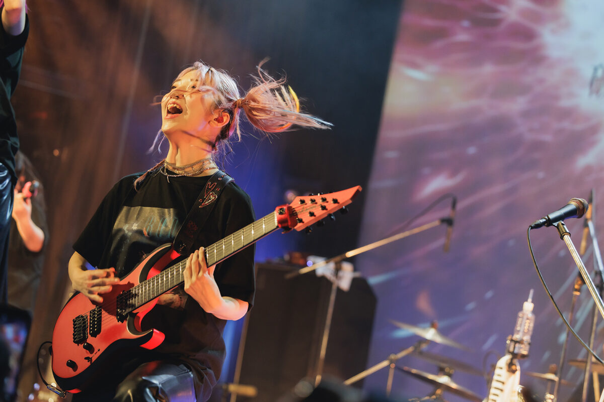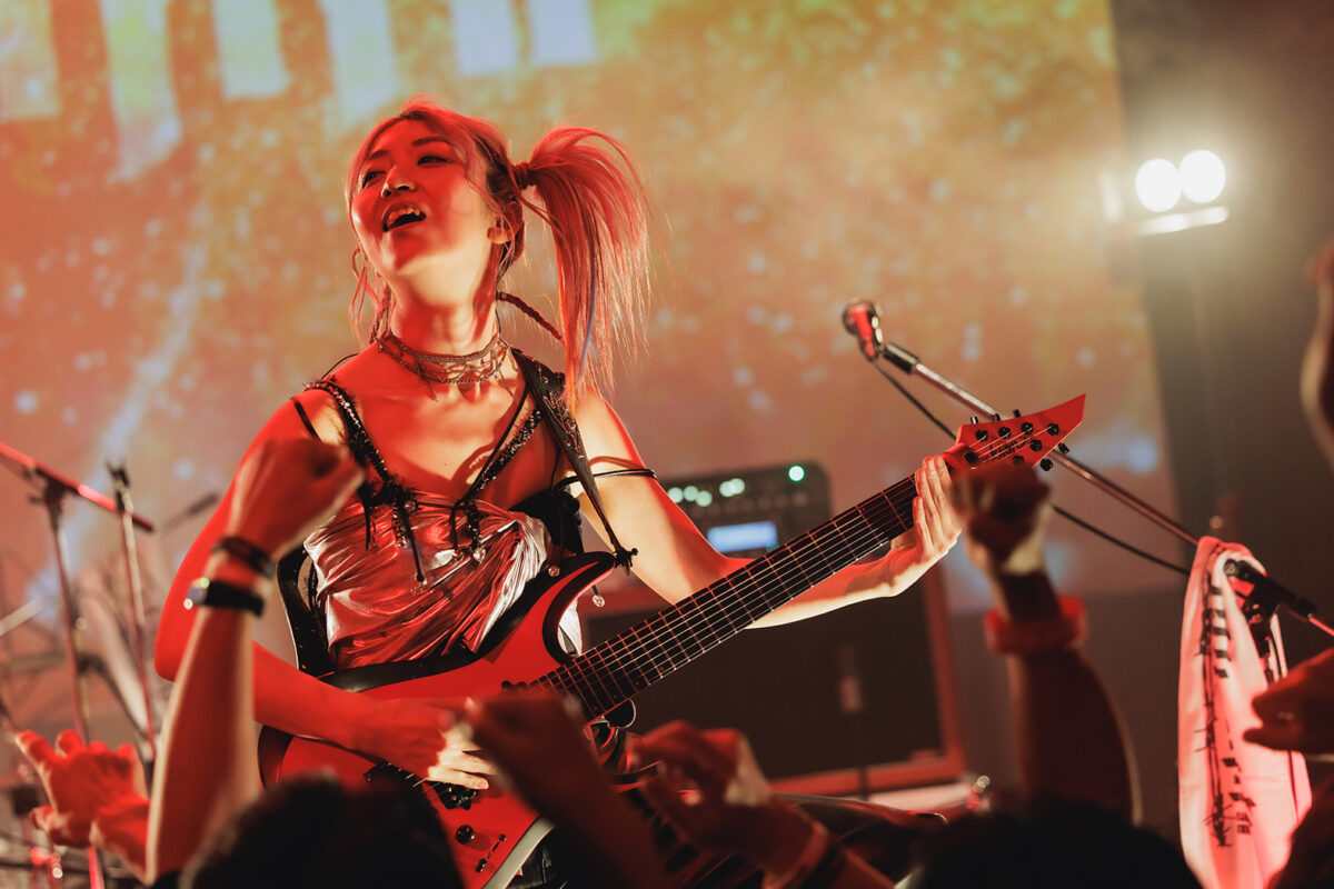 次に披露したのが、MVも制作した『Delete』。今のLittle Lilithの姿を示した最新モードの楽曲を、4人は背景にMVも投影しながらプレイしていく。ラウドとエモーショナルという、Little Lilithを形成する2つの要素を1曲の中へクロスオーバーした楽曲だ。強烈なフレーズを次々と繰り出しながら楽曲が轟音を鳴らして突き進めば、その演奏へ、グロウルを交えながらもLILLYがエモーショナルな彩りを与えていく。フロアでも、身体を折り畳み熱狂へ身を委ねる人たちがあちらこちらに誕生していた。曲が進むにつれ、ハイトーンも生かしたLILLYの歌声がエモーショナルさを増していくところにも耳が惹きつけられた。