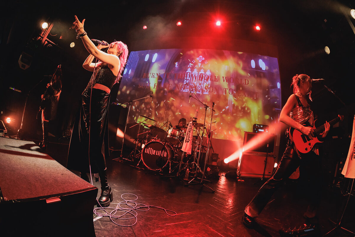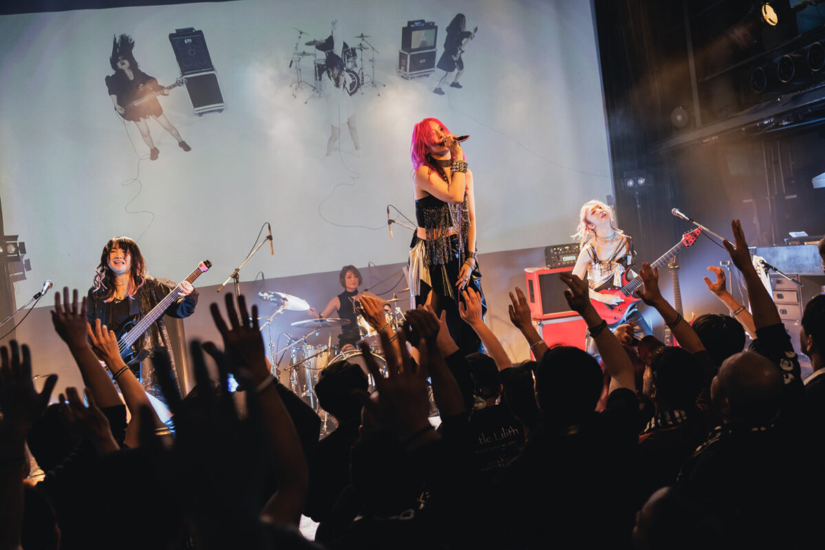 Little Lilithのライブは、アルバム『RUIN』の冒頭を飾った『Retribution』から幕を開けた。背景にはメンバーらのライブ姿を映した映像も投影している。4人とも、最初から観客たちの心臓を抉り出す勢いで歌と演奏をぶつけてきた。その気迫と破壊力に刺激を覚えた観客たちが、野太い声を張り上げ、高く拳を突き上げて騒ぎだす。豪快な演奏にあわせて観客たちが身体を折り畳む景色もLittle Lilithのライブらしい。奮い立つ音が理性を狂わせる。さぁ、このまま最後までぶっ飛んでいこうか!!