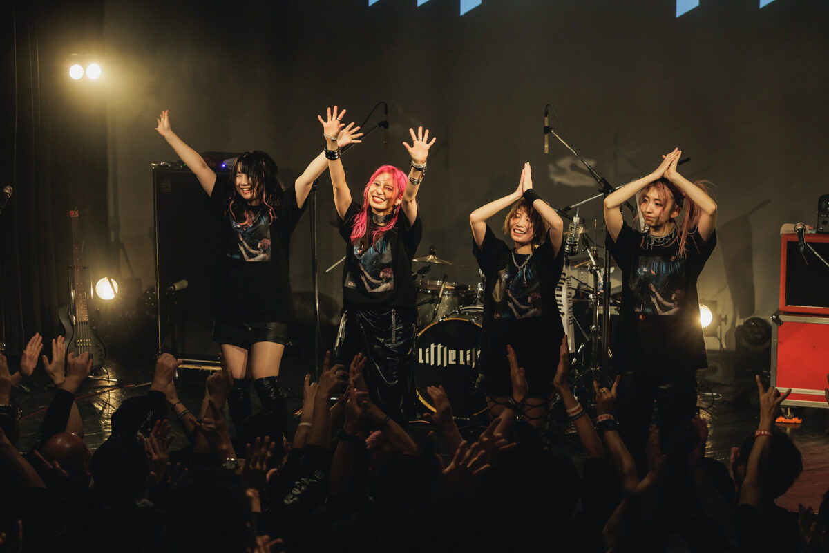彼女たちは、けっして攻撃の手を緩めることはない。続く『HellFire』でも、冒頭からLILLYが手にしたタオルを振り回して煽るように歌えば、場内中の人たちも手にしたタオルや突き上げた拳を振り回し、この場に一体化した熱狂の景色を作りあげる。高ぶったこの感情、もっともっとアゲていかないと気が済まない。後半には、LILLYと観客たちによる「Oi!Oi!Oi!Oi!」と叫び合うやりとりも誕生。他のメンバーらと声を掛け合う場面では、SHIORIが「寿司、寿司、寿司、寿司」と、YUKIは「猫、猫、猫、猫」と、ERIKAに至っては「ビール、ポテト、ビール、ポテト」とコール&レスポンスを交わす遊び心も見せながら、この会場を熱くしていった。