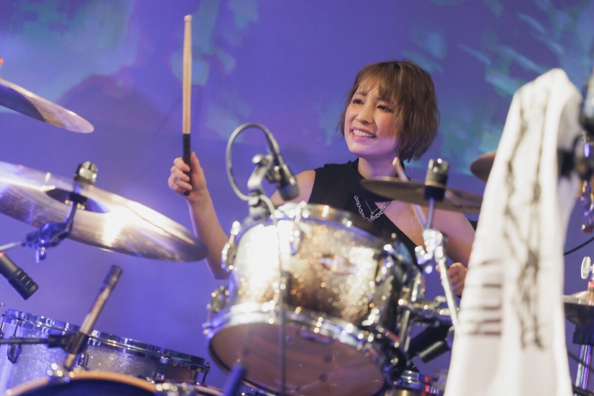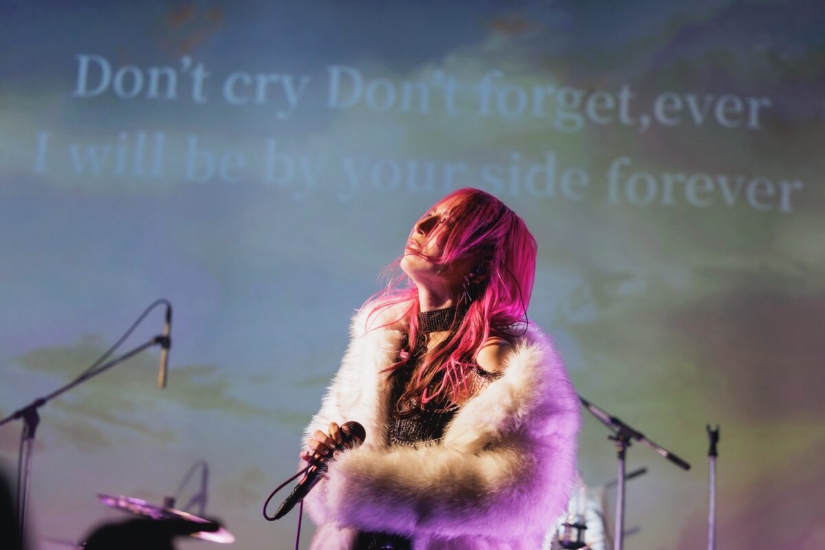 観客たちの意識を熱情的な音で掻き回すように、Little Lilithは『Hallucination』を演奏。ここまではアルバム『RUIN』に収録した曲順通りの流れだ。それもあるのか、アルバムで受けた衝撃を、臨場感を増した生音で体感しているような気持ちだ。冒頭からずっと背景にリリック映像を映していたのも、彼女たち自身が突きつけたい思いやメッセージ、示した生きざまを、轟音の中でもしっかりと一人一人のハートに刻もうとしていたからに違いない。