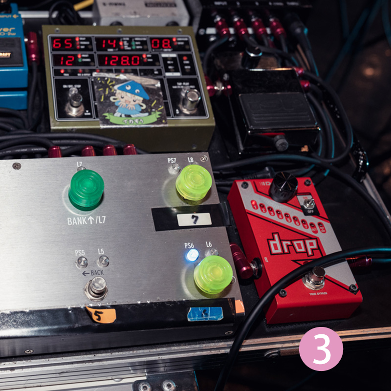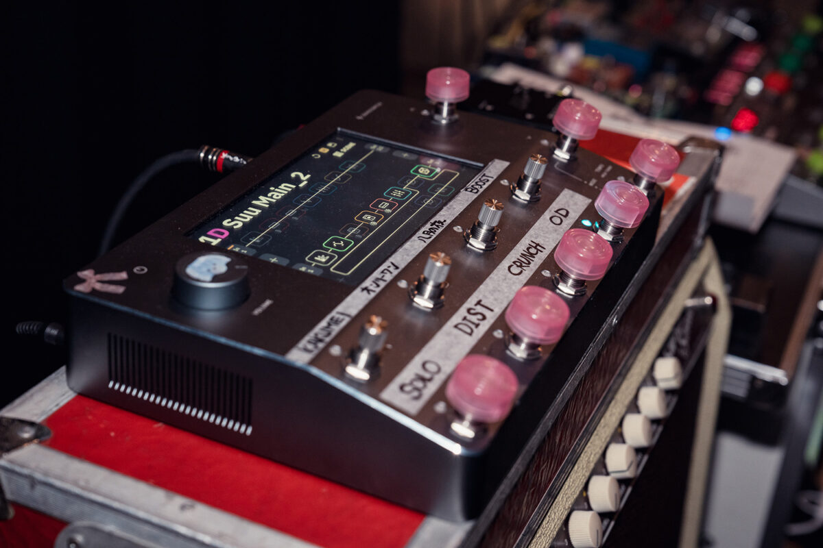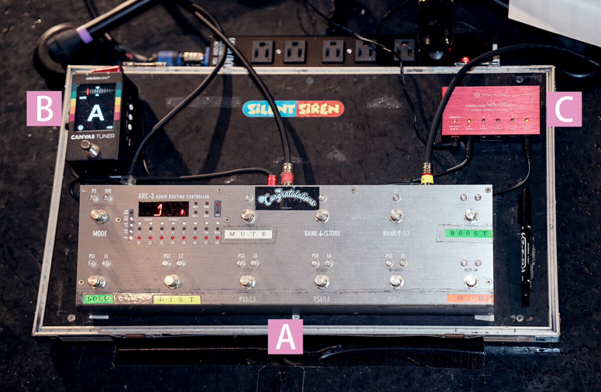ステージ袖にセットされているすぅのペダルボードがこちら。本誌での前回取材時(2025年2月27日SILENT SIREN LIVE TOUR 2025 15th Anniversary「Lady to go」東京公演時)と特に変更は無いようだ。ステージ上の本人の足元にも同期されたFree The Tone ARC-3が用意されており、どちらからもサウンドを切り替えることが可能になっている。