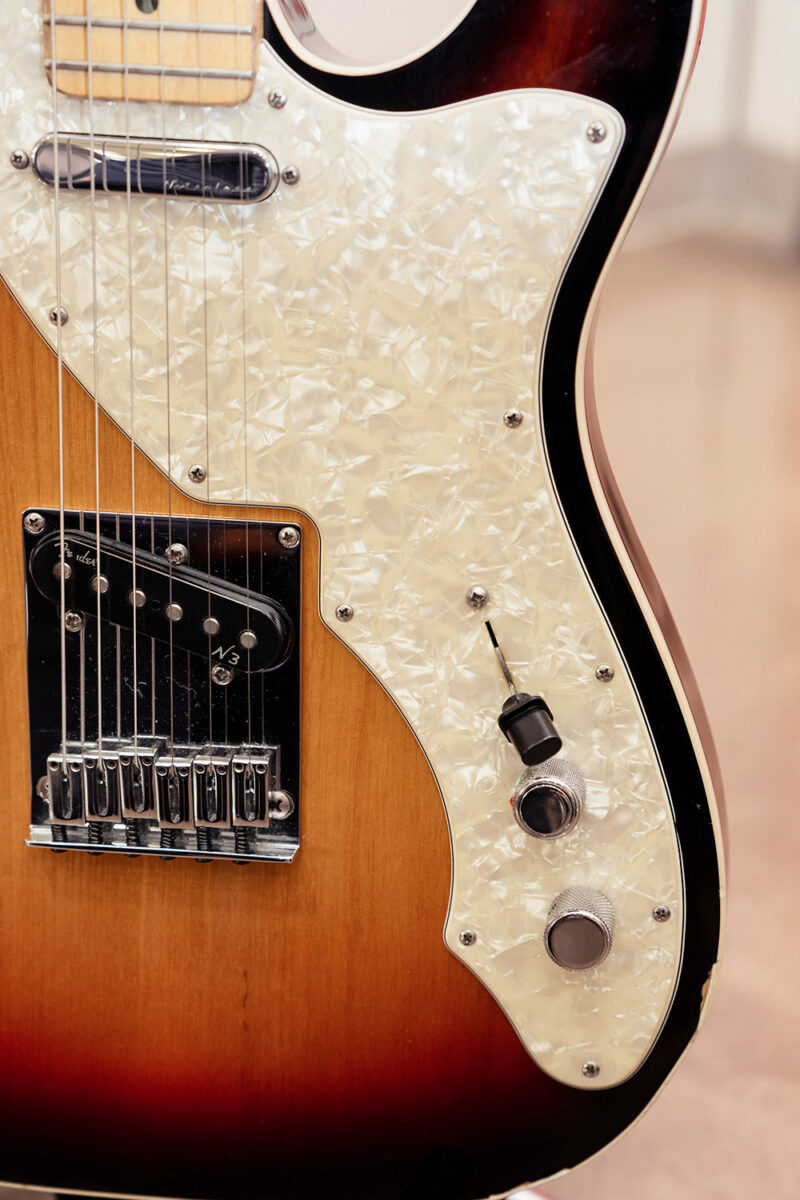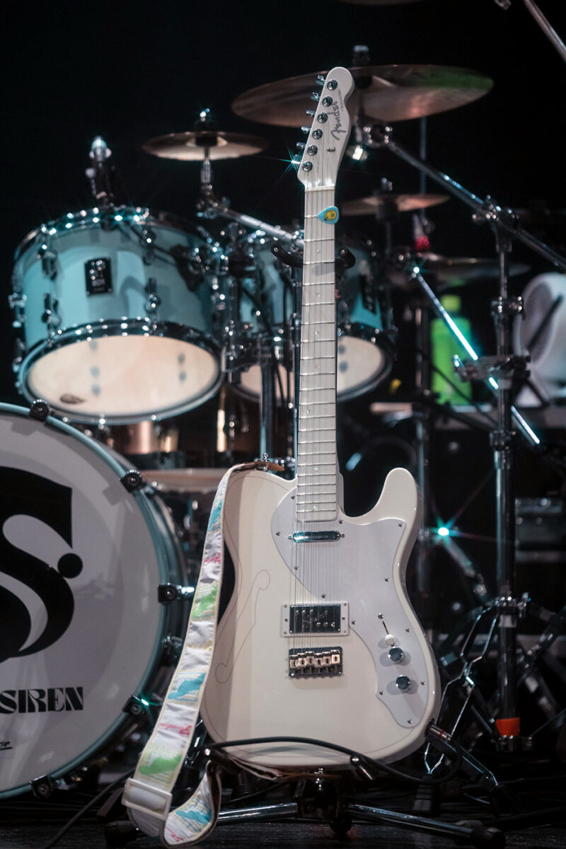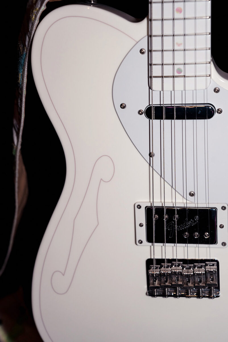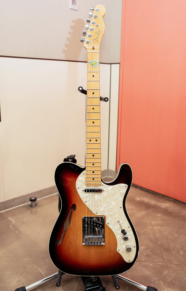 2013年製のAmerican Deluxe Telecaster Thinline。セミホロウのアッシュボディにメイプルネック/指板という材仕様。ピックアップはFender Noiseless N3 Single-coil Tele Pickupsが搭載されている。どんなシチュエーションでもいい音を出してくれるとすぅ自身も信頼を置く一本だ。ストラップにはComfort Strappが使用されていた。