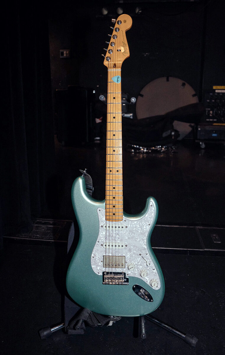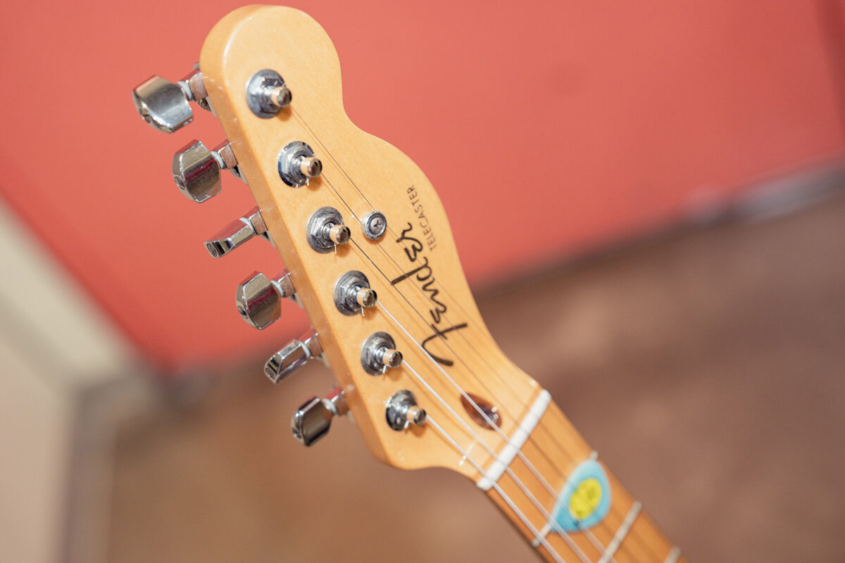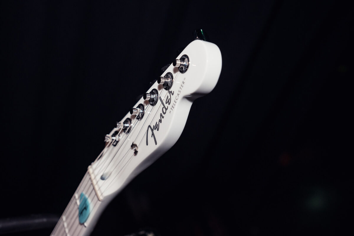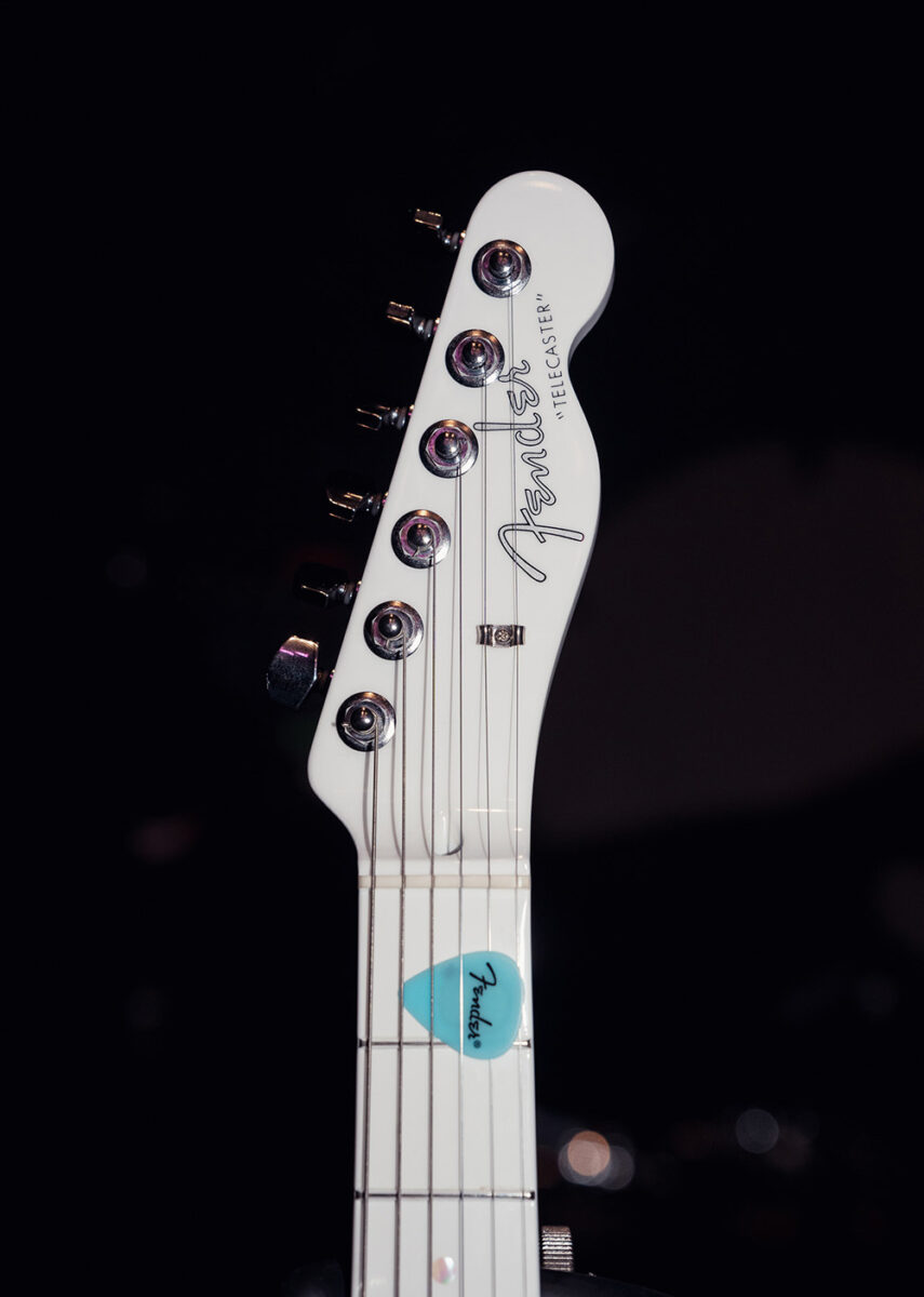 2013年製のAmerican Deluxe Telecaster Thinline。セミホロウのアッシュボディにメイプルネック/指板という材仕様。ピックアップはFender Noiseless N3 Single-coil Tele Pickupsが搭載されている。どんなシチュエーションでもいい音を出してくれるとすぅ自身も信頼を置く一本だ。ストラップにはComfort Strappが使用されていた。