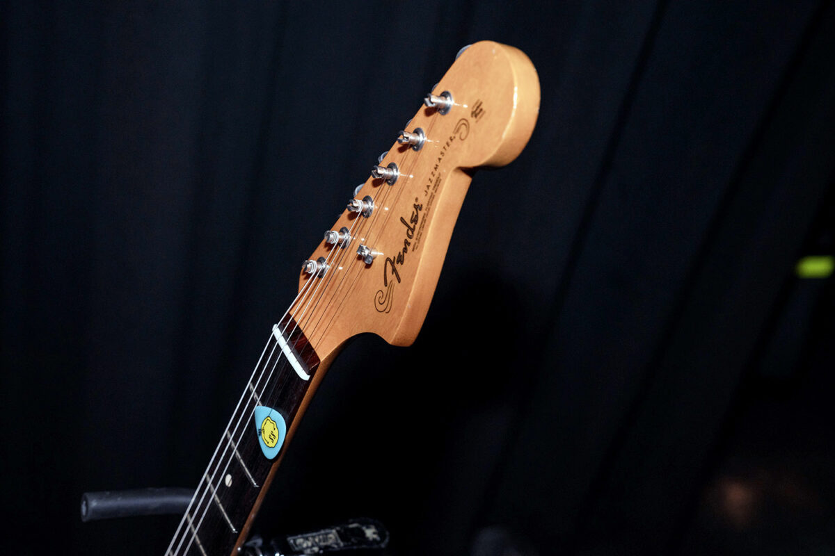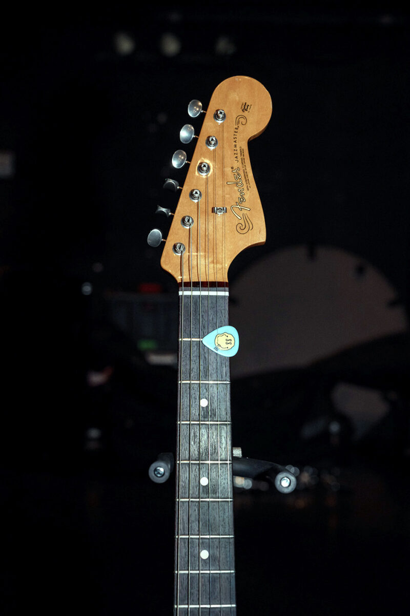 2013年製、当時限定生産されたシェルピンクカラーのジャズマスター。アルダーボディ、メイプルネック、ローズウッド指板で、ピックアップには出力の高いSpecial Design Hot Single-Coil Jazzmasterが搭載されている。見た目の可愛らしさとは対照的な突き抜けるようなソリッドなサウンドが特徴だ。ブリッジサドル後方に取り付けられているのはGruv Gear製のフレットラップ。ブリッジとトレモロ間の弦の共振を抑えるために取り付けられているものと思われる。