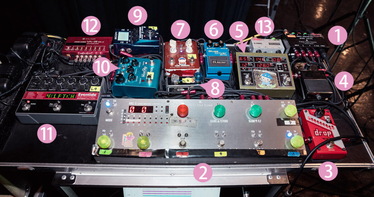 こちらがステージ上の本人の足元のボード。前述した、コントロール用の [ A ] Free The Tone ARC-3以外はチューナーとパワーサプライのみで構成されている。