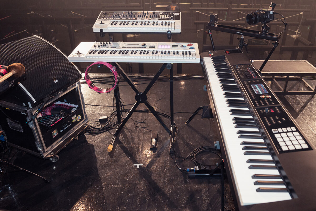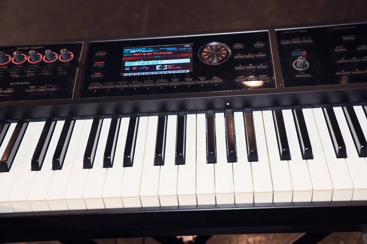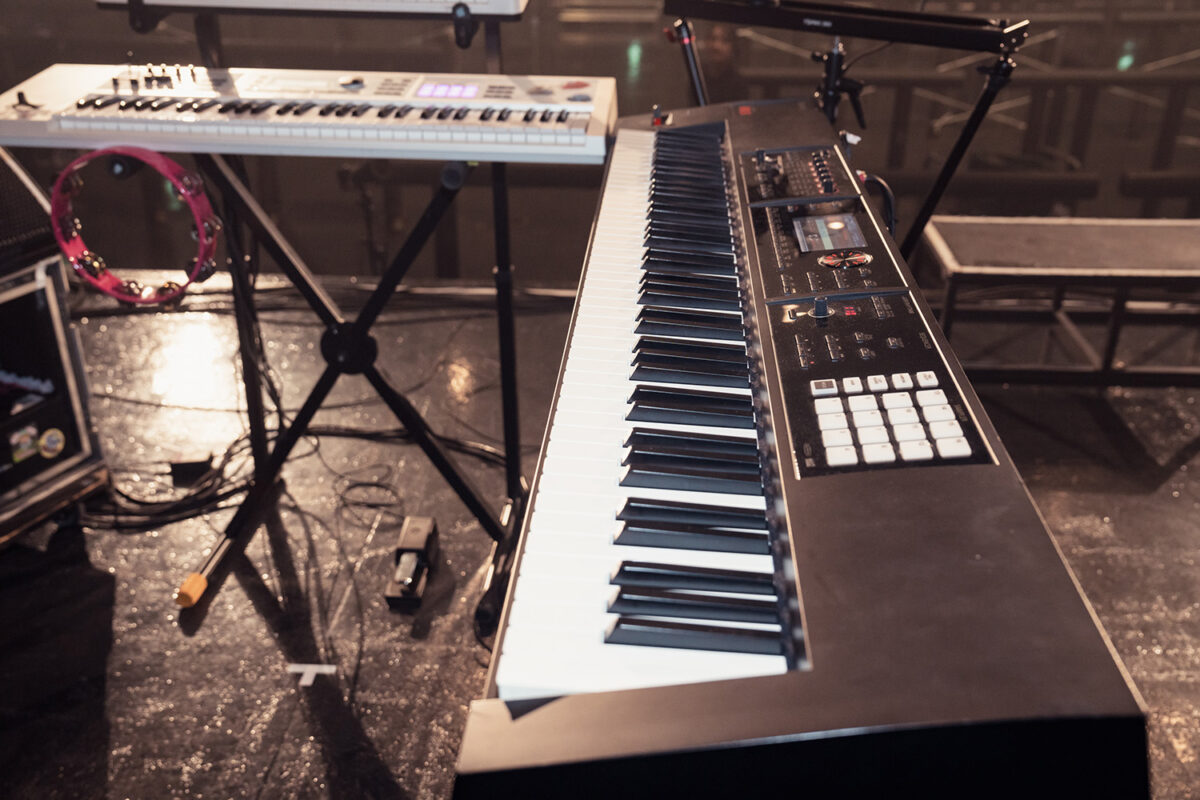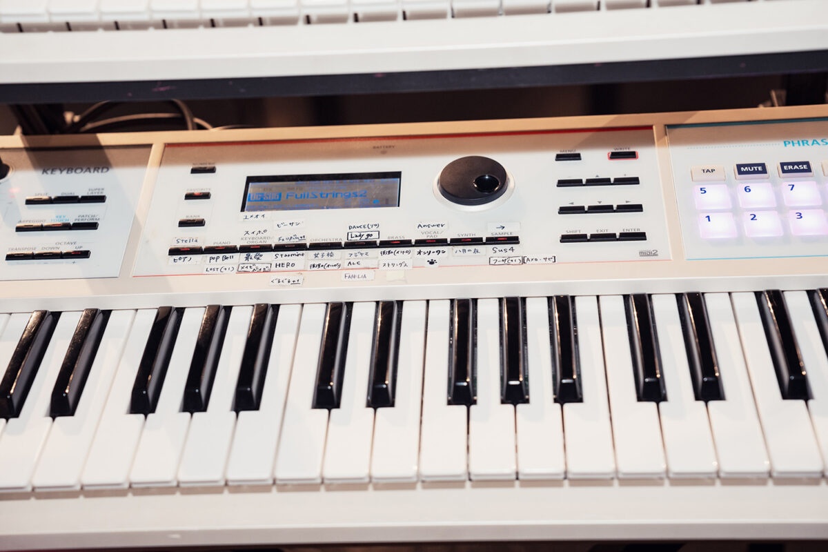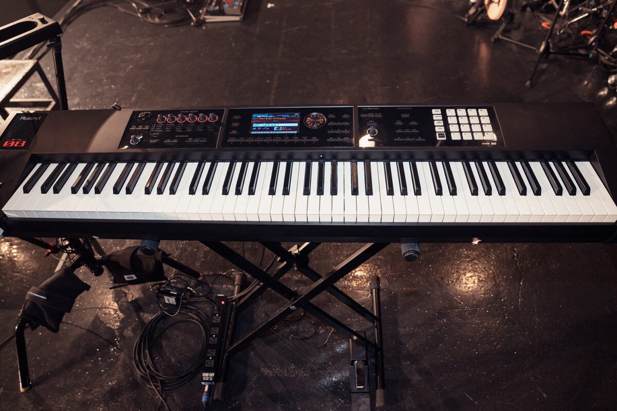 本人の立ち位置向かって右手側(客席から見て左側)にセットされていたのはRolandのミュージック・ワークステーション・シンセサイザーRoland FA-08。ピアノ・アクション搭載の88鍵アイボリー・フィール G鍵盤仕様モデルで、内蔵された高品位なピアノやエレクトリック・ピアノ音色の演奏に真価を発揮する。