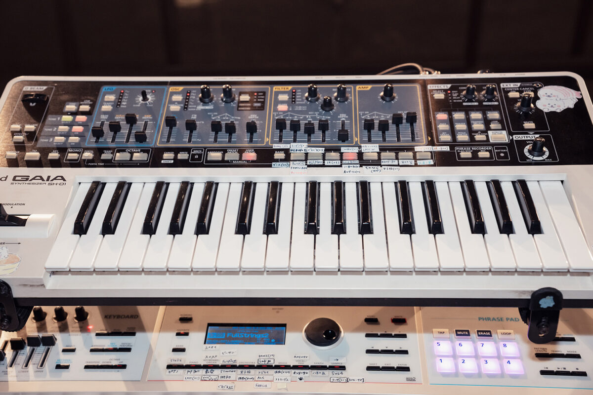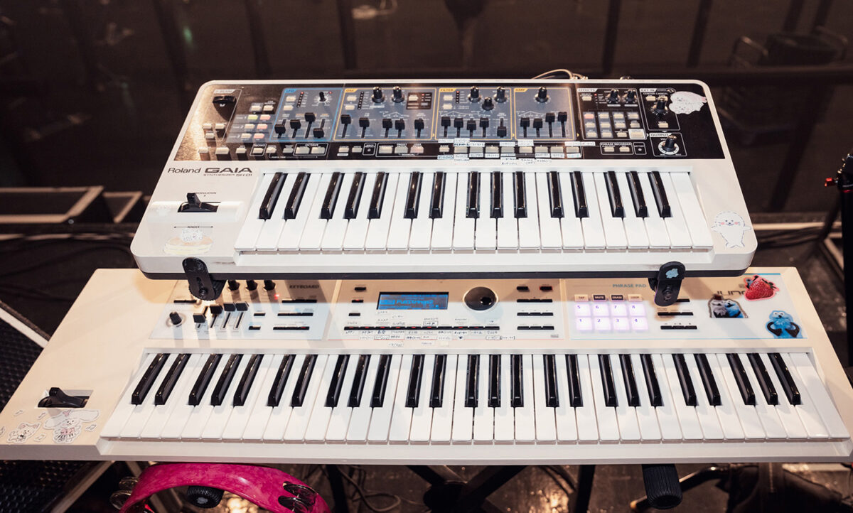 正面側は2台のシンセサイザーが上下段にセットされており、上段がバーチャル・アナログ・シンセサイザーRoland GAIA SH-01、下段が可搬性も含めライブ向けに開発されたキーボードRoland JUNO-DS61W。