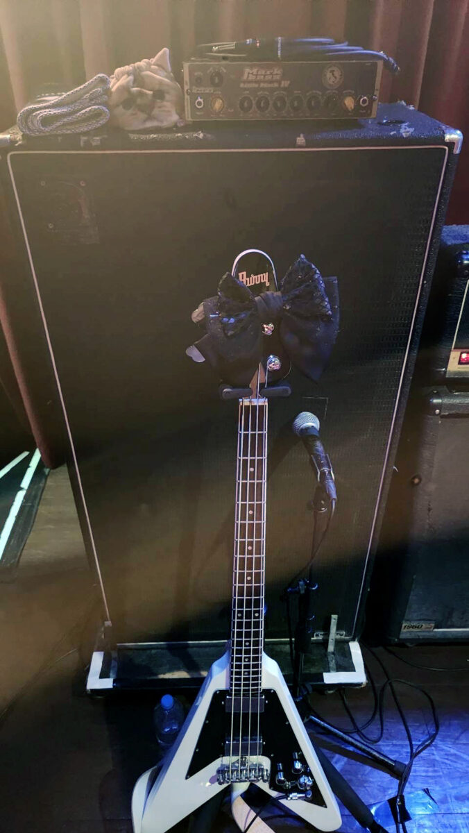 HARUのベースはBurny製のFlying Vタイプ。ヘッドに結ばれたリボンがトレードマークだ。