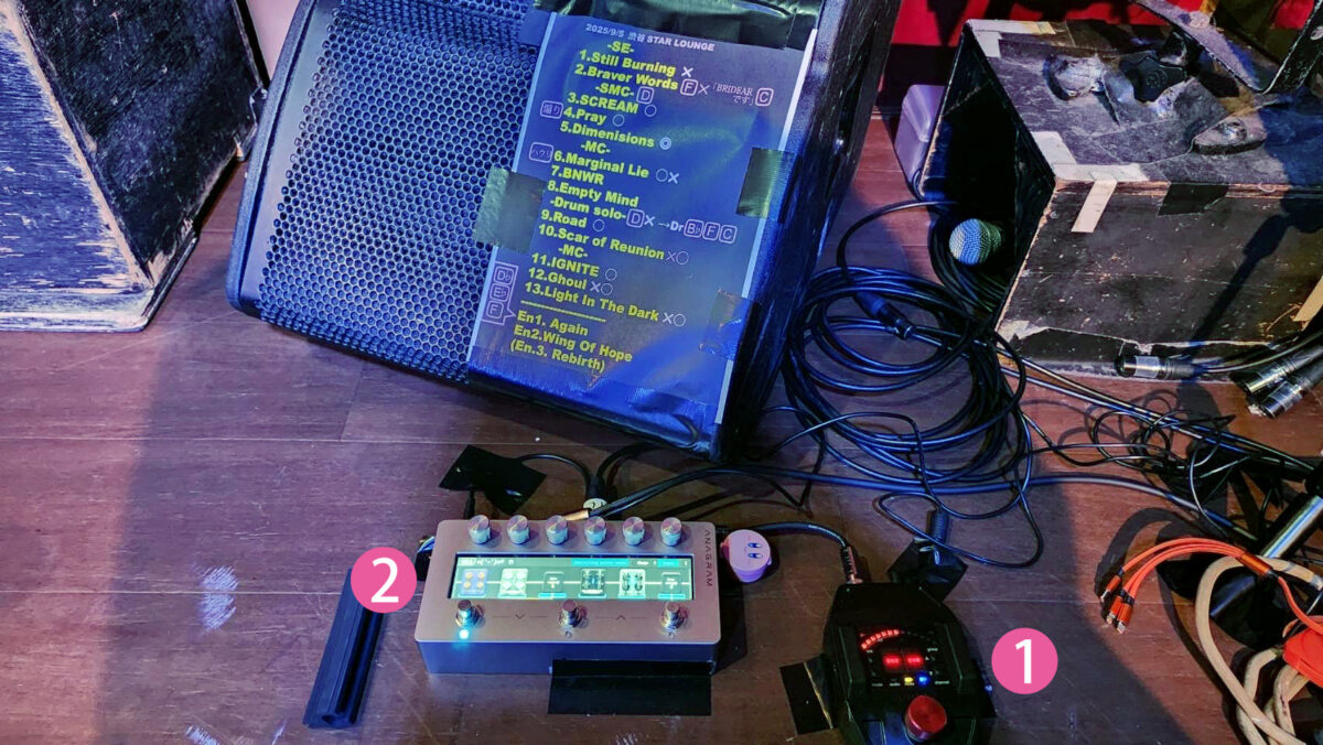 HARUの足元は新たに導入された ( 2 ) Darkglass Electronics ANAGRAMが各種エフェクトからプリアンプまですべてをになっている。