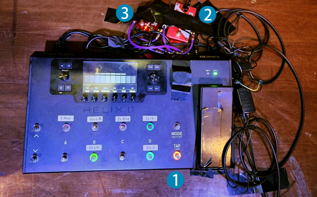 足元は ( 1 ) LINE6 HELIX LTを中心にしたセットアップ。 ( 2 ) と ( 3 ) は ( 1 ) のエフェクトループ(SEND/RETURN)に接続されている。