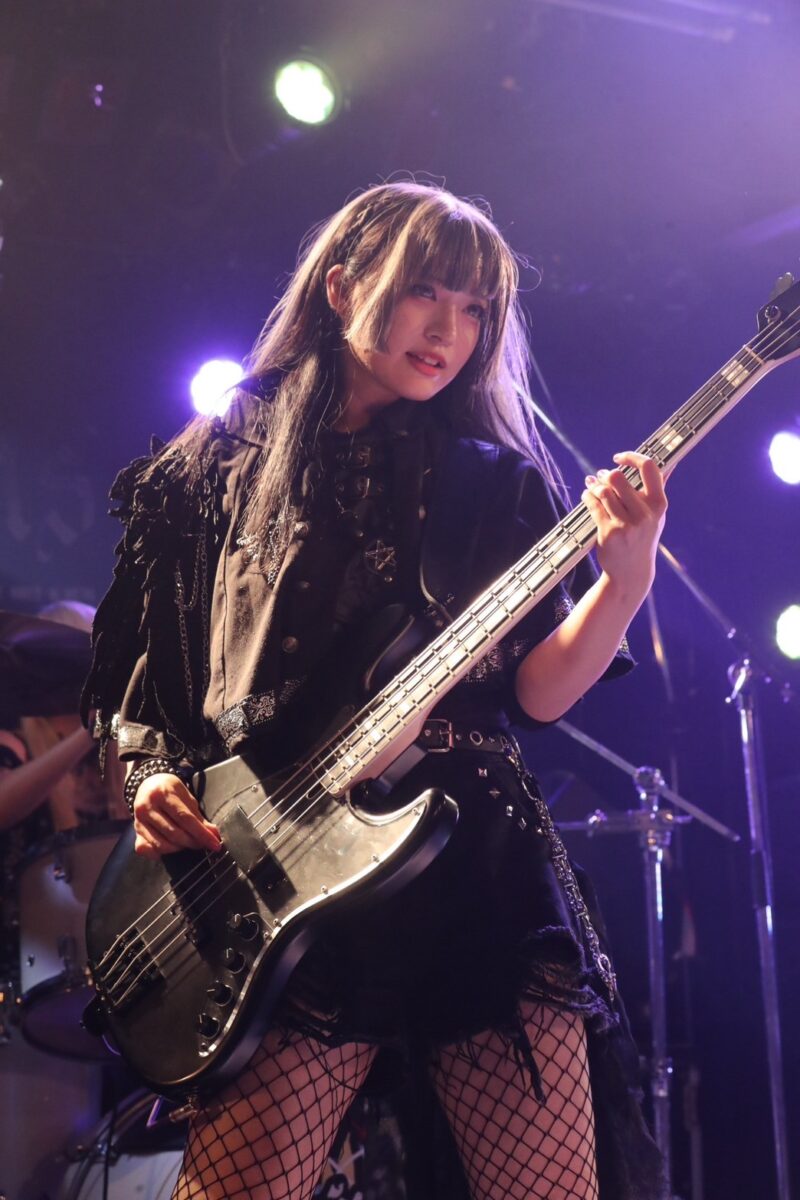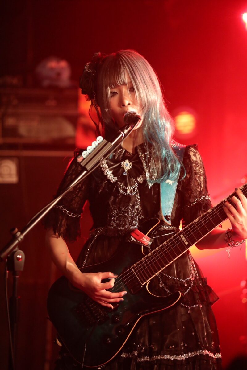 立て続けに、あにゃと菫による2本のギターが寄り添うギターソロのコーナーへ。常にユニゾンでプレイしながら、ときに上手くハモらせたり、ソロを交わしあうなど、それぞれの持ち味もしっかりと提示してゆく。ライトハンド奏法から速弾きまで、ユニゾンしたプレイを見せながらも、個々の色も2人はしっかりと見せていった。