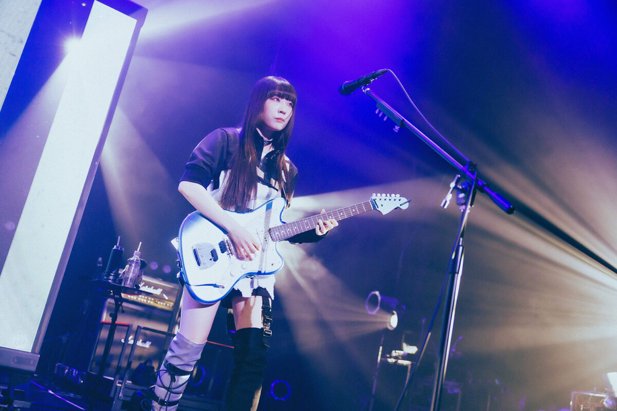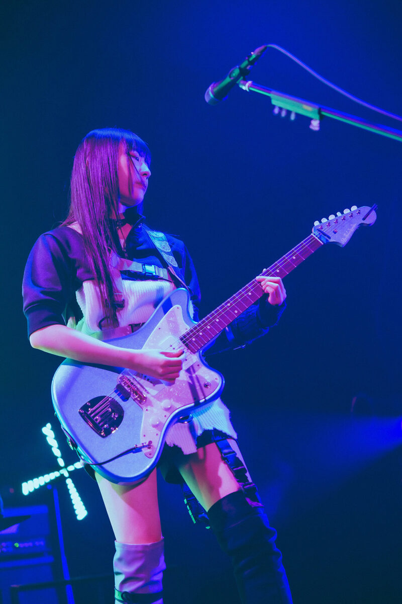 仁菜がギターボーカルとしての姿をあらわすのは、アニメ最終話で『運命の華』を披露するとき。しかしリアルのトゲナシトゲアリは、その先の未来を見せてくれる。『渇く、憂う』『声なき魚』など、多様な楽曲でギターを掲げながら歌う理名の姿が見れるのだ。